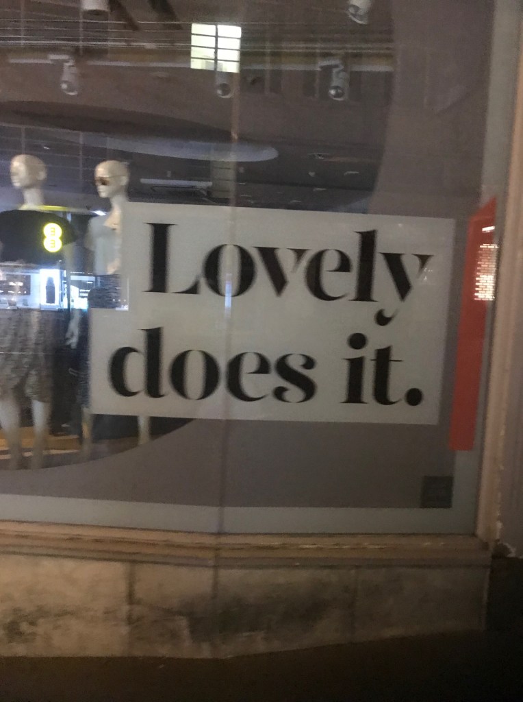 Feeling inspired on my drunk walk home after a Saturday night out on Bournemouth town! – The youths and yobs or “tweens” as I refer to them were shouting around, running everywhere like loons… It really did remind me of a scene from Shaun of the dead! – Unless you fitted in and made zombie noises you were about to get ate! Random old guys eyeing me up with my legs out in my skirt; “Look at the legs on youuuuuu” **Here I am eye rolling…. I got a glass bottle launched at me by a rather aggressive member of a hen party… I was feeling quite the target being the small town gal I am! BUT that didn’t stop me on my mission to pause in the moment and stop to photograph Topshop window and the typeface that I took an instant like to! 😀 #dedication