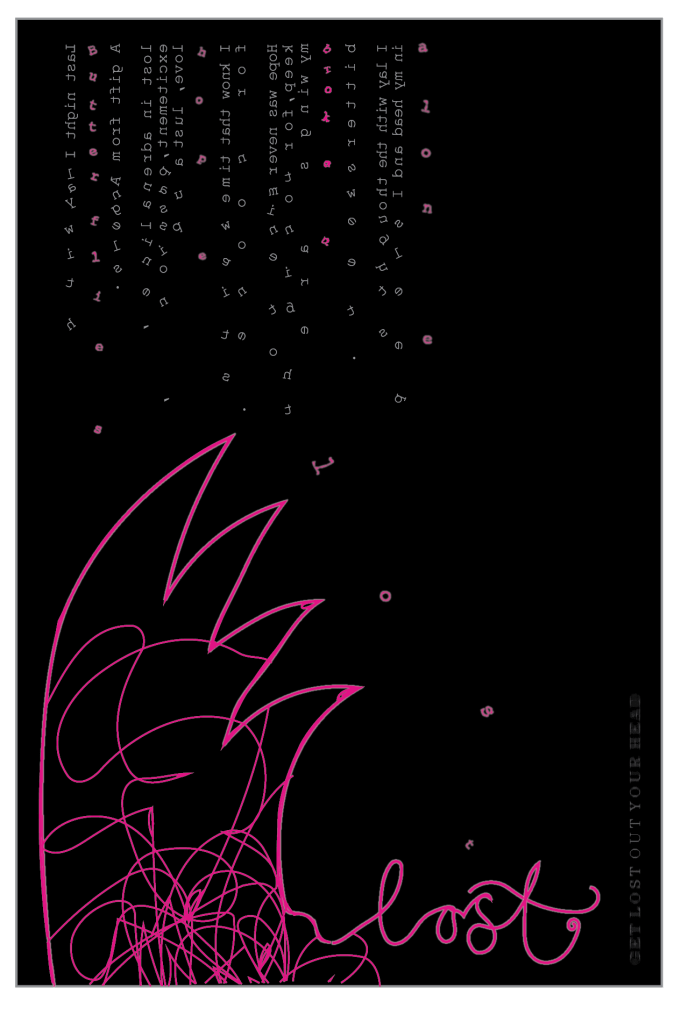 The text I have used for this piece is a poem I wrote myself. It is raw emotion which is what I wanted to portray. It shows real feelings. I decided to place it along the top of the postcard in the end as it is more believable for the type within it to be falling down that way. I reflected it and made the text backwards so that the type was facing downwards on the postcard. I took the last words from each sentence and dropped them down to create the falling effect. The text is really hard to read and not very legible at all.. this is the point, it is supposed to be messy and confusing to read; as messy and confusing as the thought that was in my head.