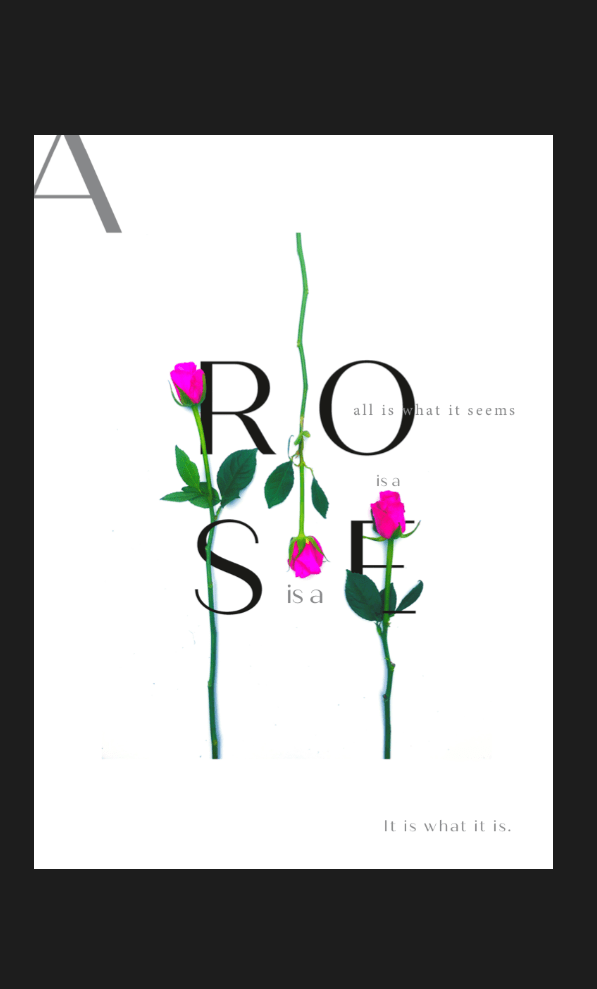 I then wanted to include a little bit of text. “A rose is a rose is a rose” and position the wording around the 3 roses. I wanted the design to be quite spacious and minimalistic.