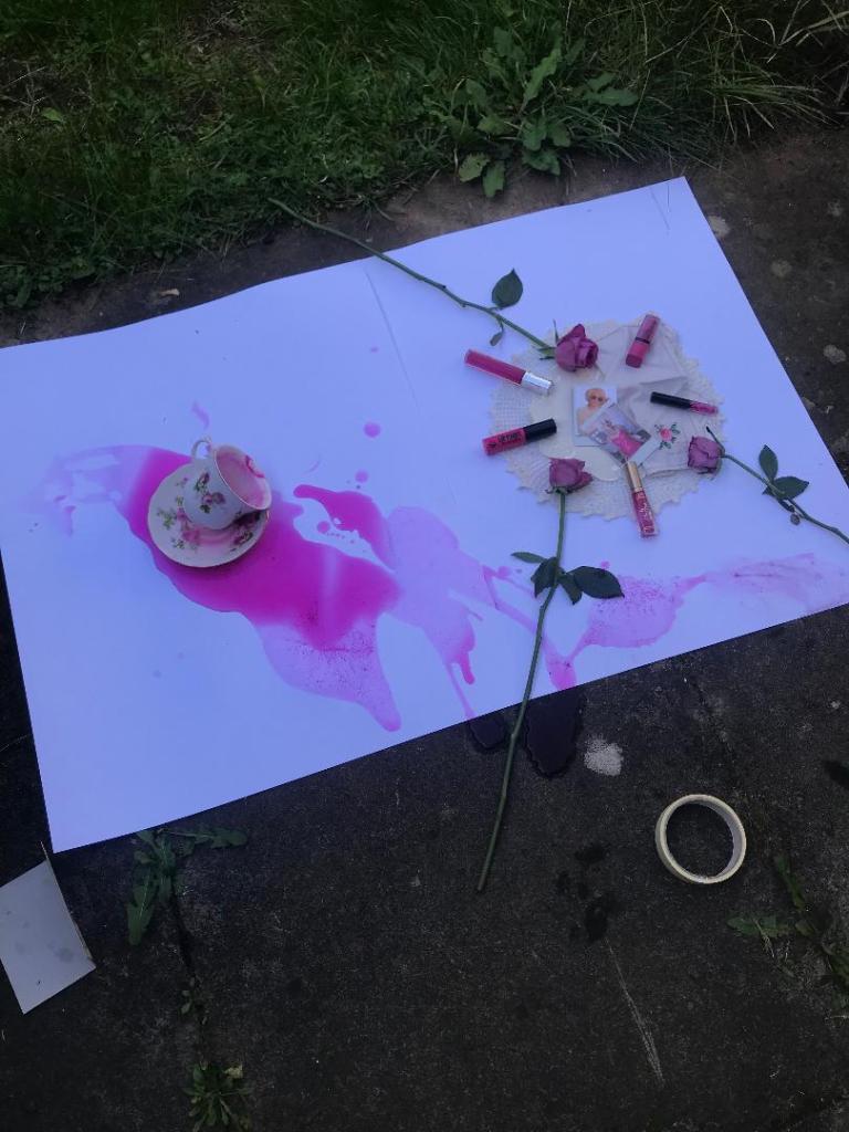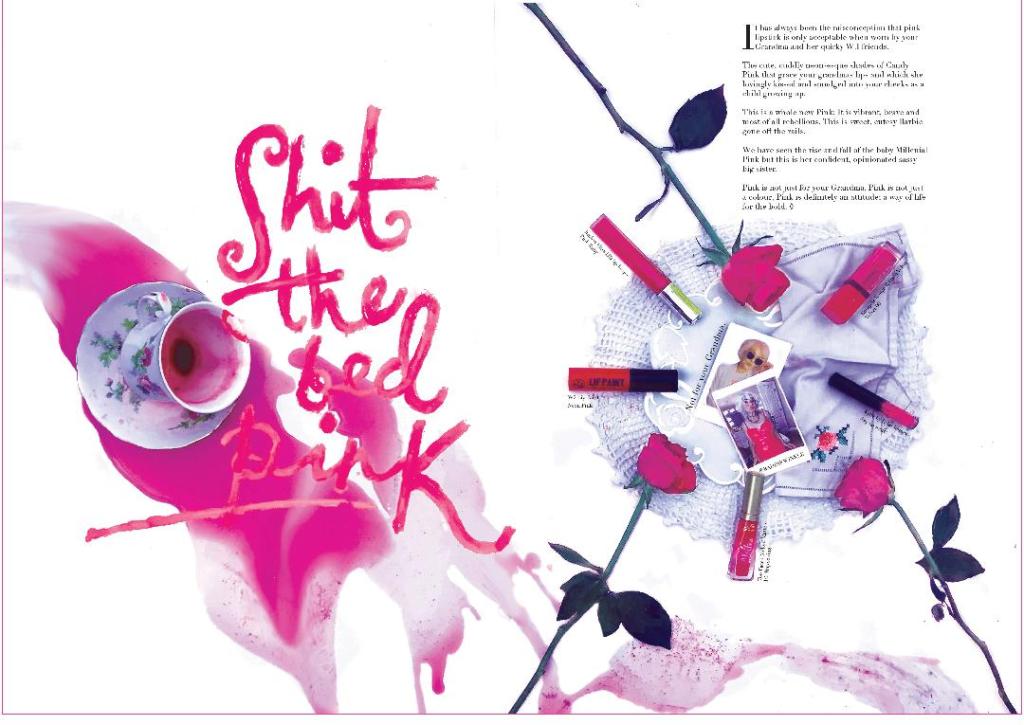 I decided to use my own photographs, I did a nice little flat-lay on my patio which involved one of my Grandmas old pink floral tea cup and saucer, some pink food colouring to dye the “tea” pink, a lacy doily and a nice little cross stitch handkerchief my Grandma cross stitched and a selection of my favourite lipglosses I use on the daily! I also included Polaroids of Baddie Winkle; she is a 92 year old Instagram star, renowned for her love of pink and dressing like she is 20! I thought this would show an edgy, cool, humerous side to “It’s not for your grandma”
