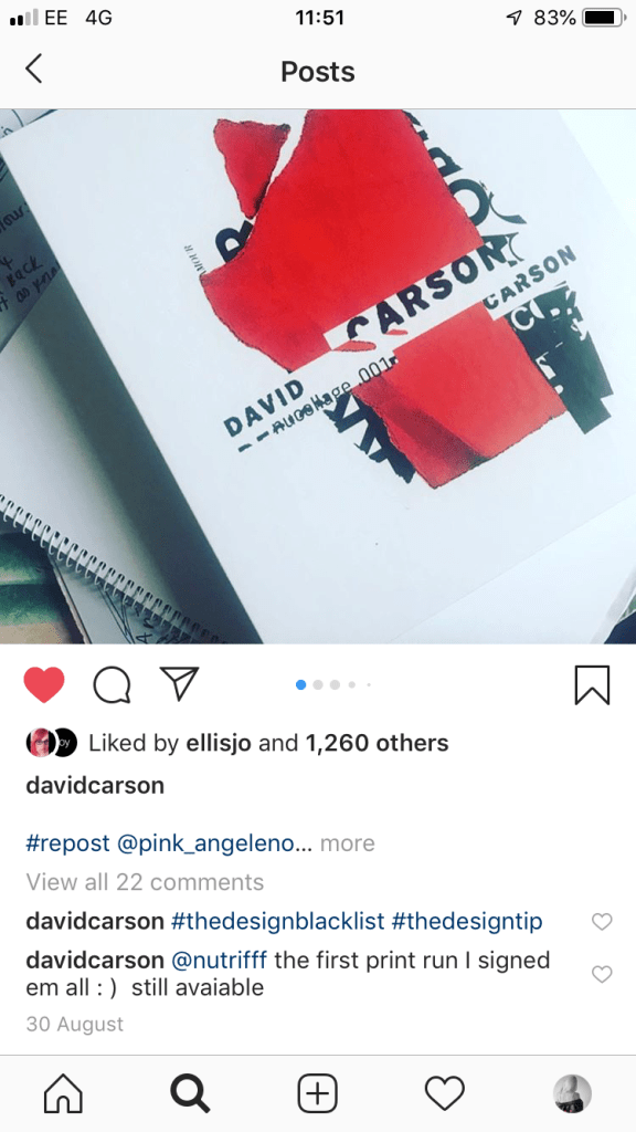 I did however have my 5 minutes of fame on his Instagram! (which I enjoyed bragging about to my fellow design friends! ;p) I waited what seemed FOREVER on receiving my SIGNED edition 😉 It was probably 6 weeks in the post in all honesty; I was starting to think Mr. Carson had forgotten my order! However! the day it arrived on my doorstep I snapped a very basic, uninteresting photograph of it in all its glory and posted it to my @pink_angeleno instagram page (tagging him in it) and expected nothing more than a few likes from my designer friends…