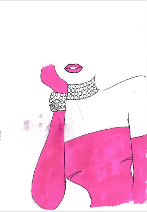 I really liked it though because of her unkempt hair, dark roots and the style I have drawn it in – (I love ink drawings). I used one of her iconic halter neck dresses but did not feel like it really helped distinguish who she is supposed to be. I then looked into “Diamonds are a girls best friend” which I could change to “hairdressers are a girls best friend” and googled her outfit that she wore in that film which was a pink dress and long matching gloves and diamond earrings and necklace. I then drew this to alter the original drawing: