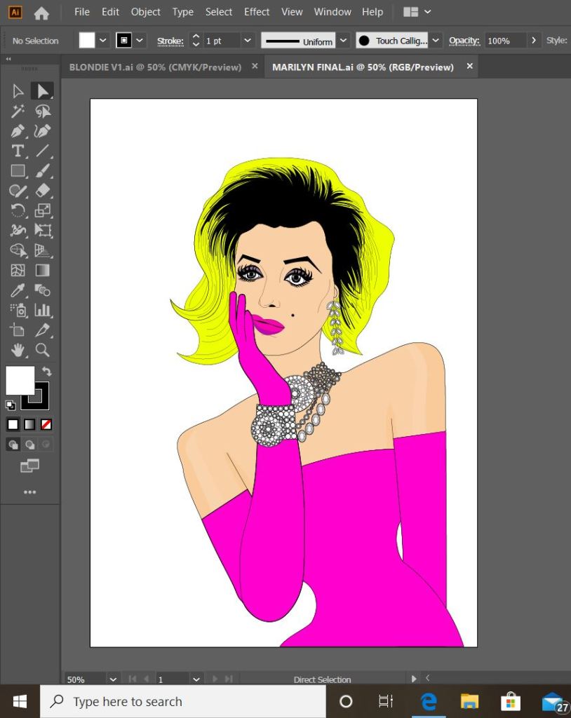 Now that I have finished the vector drawing of Marilyn the next stages are to complete the other designs in the series; I then need to work on the background and the messages of the cards.