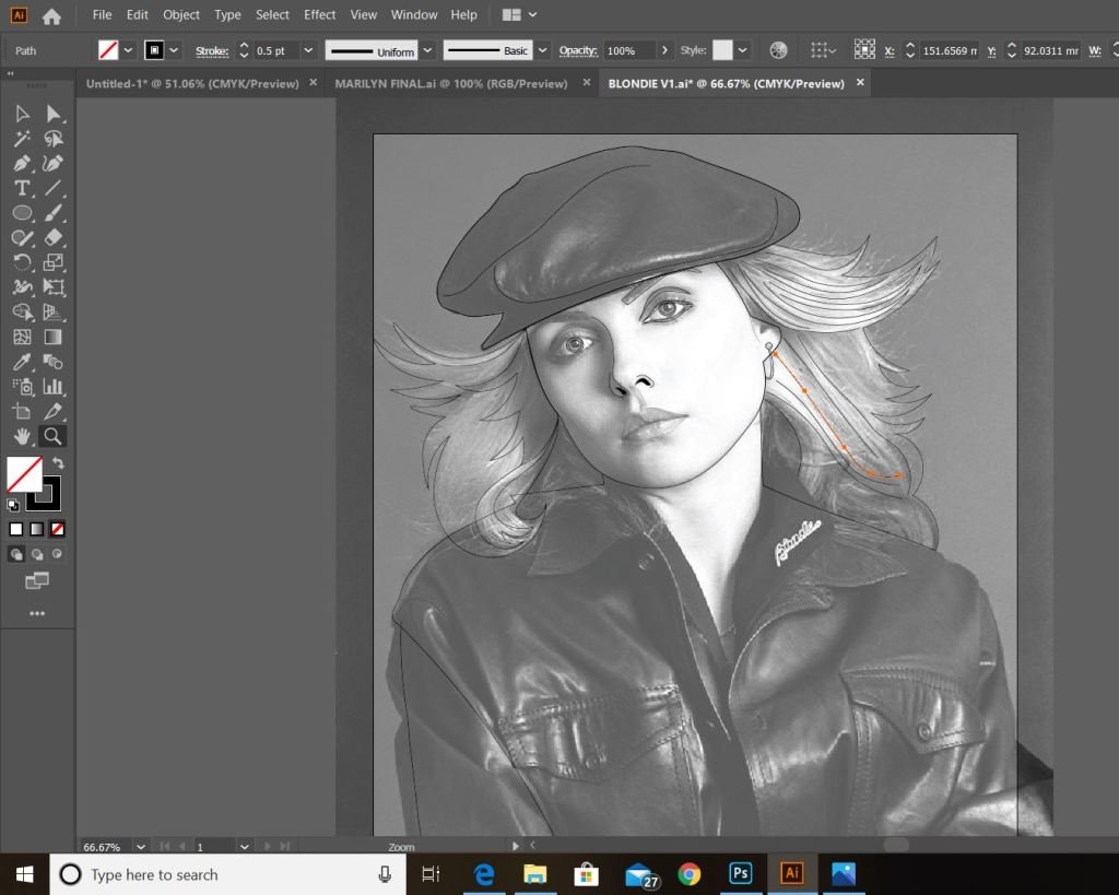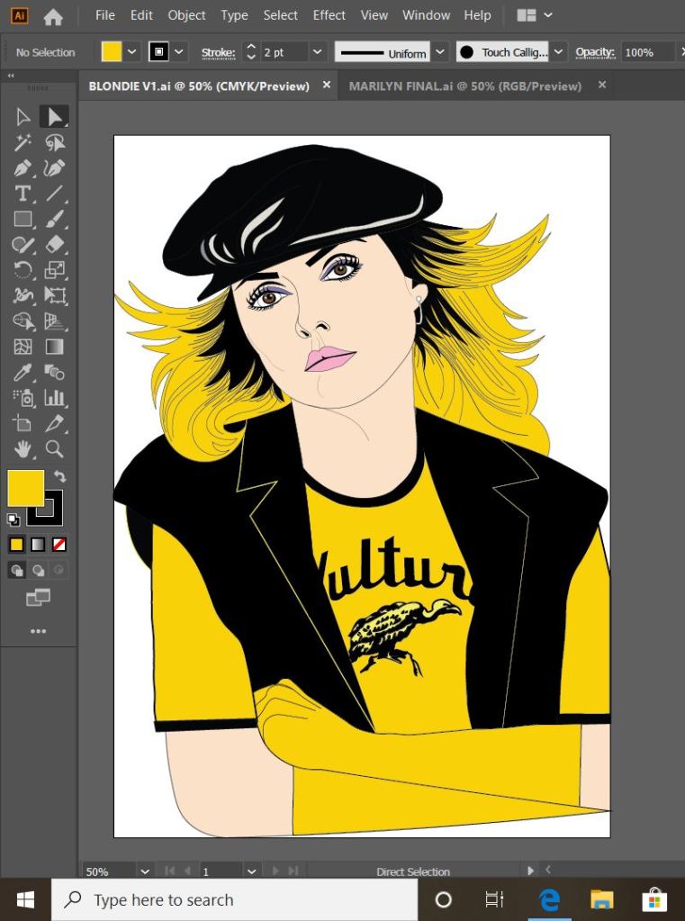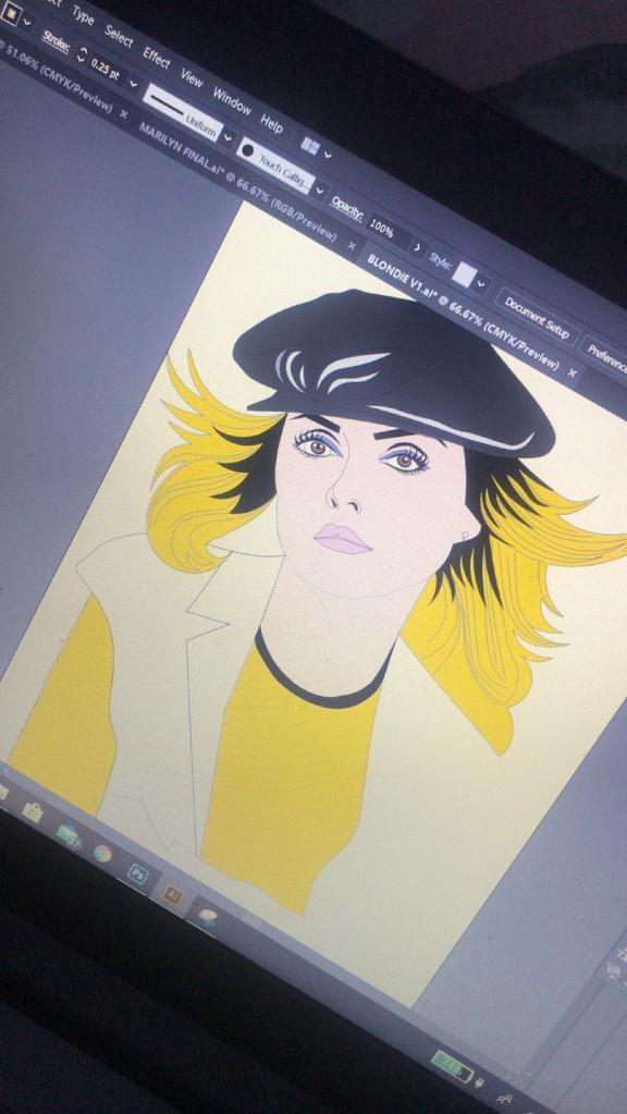 This is exactly the same process as what I did with Marilyn. I traced around the image completely in Illustrator with the pen tool and just added colour, texture, tone etc! I wanted to represent Debbie Harry as true as possible from the “Atomic” music video and this image that I have found of her is not from that video.. therefore I had to find several separate images of her outfits to draw from. I did try and play the music video and screengrab from that but the resolution was too poor. In the music video she wears an iconic “Vulture” t-shirt, I searched online to find this logo to draw from.