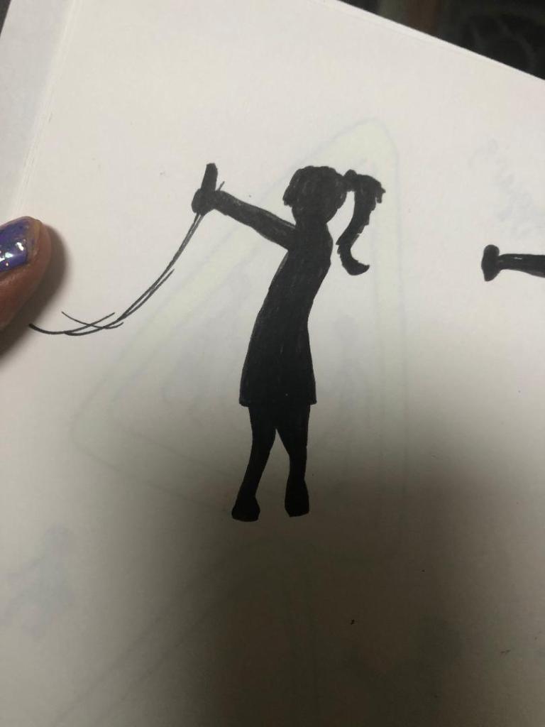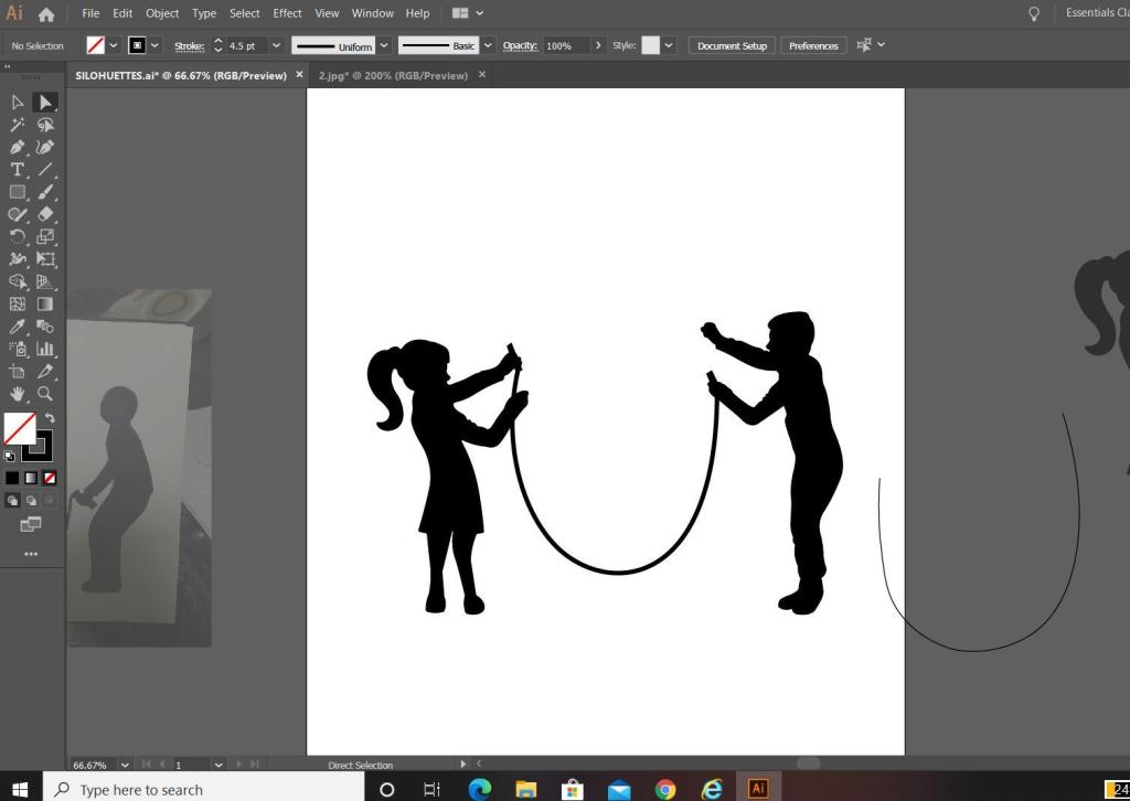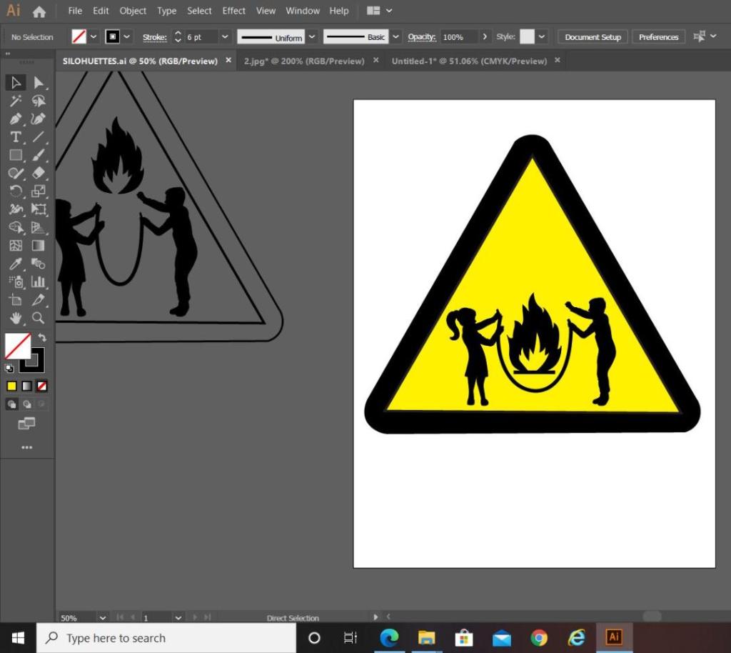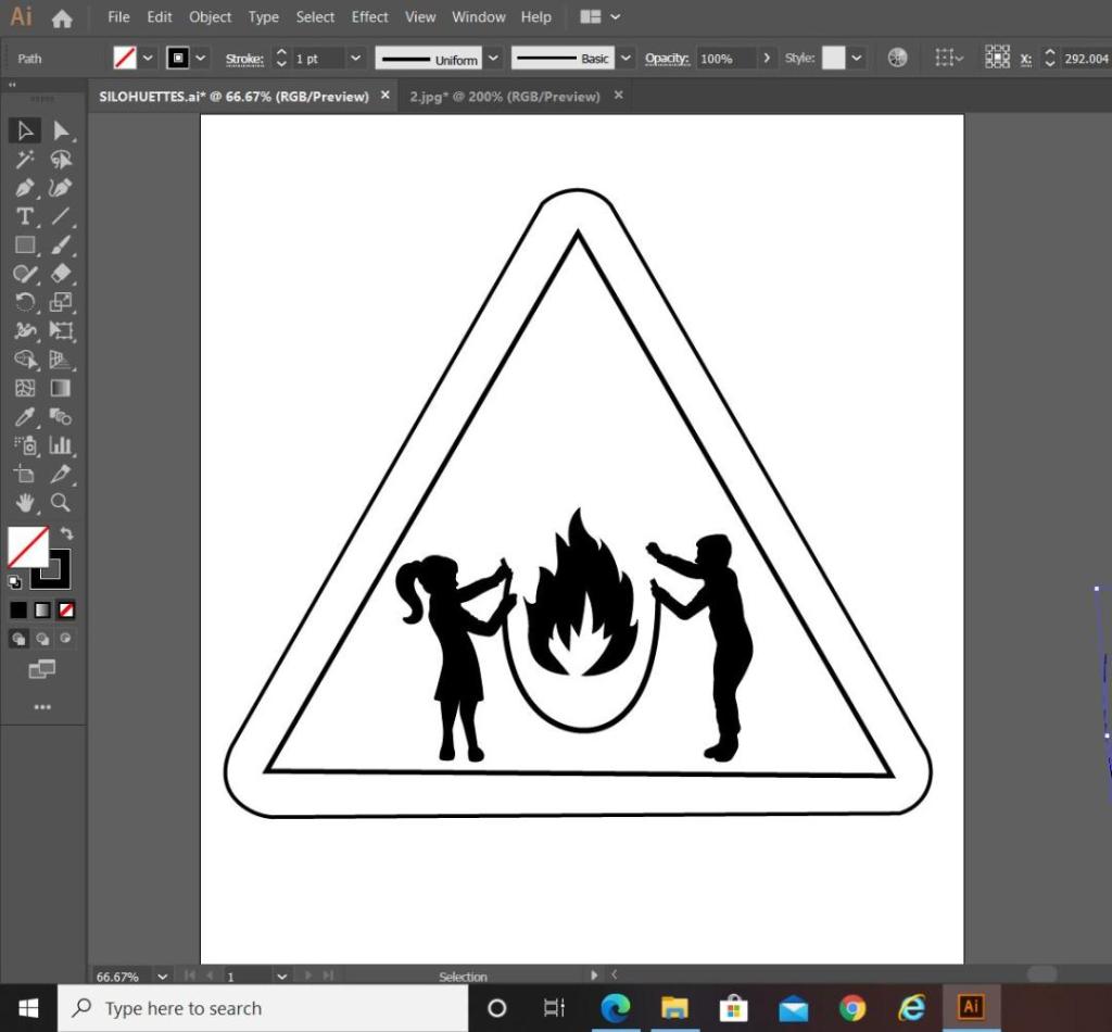The next step was to add the skipping rope into the equation. I used the pen tool to create a perfect arc shape for it and then added handles in the hands of the children. I played with the thickness of the rope; I chose in the end to keep the rope thick in appearance to match the rest of the sign, I did think about making the thickness (or weight) of the rope thinner to give contrast to the image and to potentially break elements up to see if it would be clearer on the eye but swayed against this decision because it all needs to be bold to stand out as a caution sign potentially from a distance.