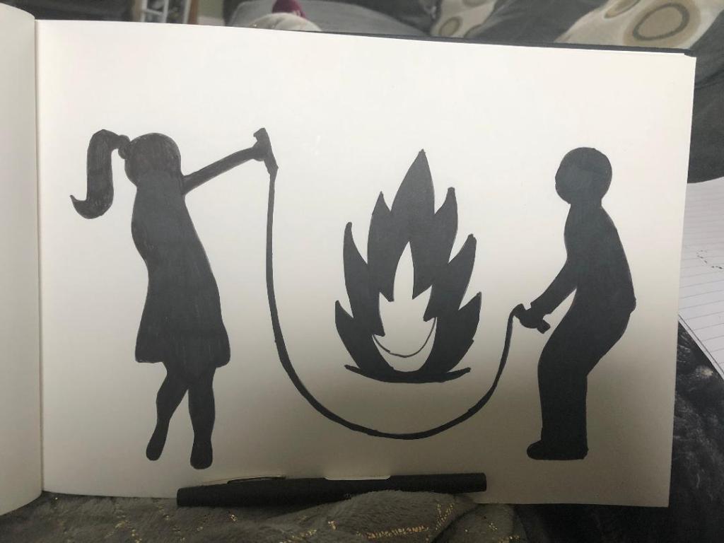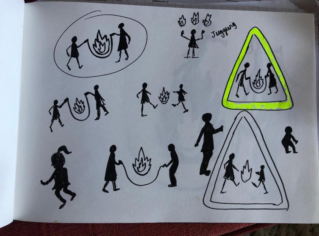 From this point I started sketching some rough drawings. I wanted to make the “playing” part very clear. As soon as you look at the sign the message of “play” needs to be very clear. I pondered using football and other ball sports which could include the use of a fireball but the idea of skipping was very dominant in myself and my boyfriends mind. The idea was to have the 2 children holding a skipping rope either side and the fireball is playing in the middle. I think the idea works. It is simplistic, snappy and easily understood.