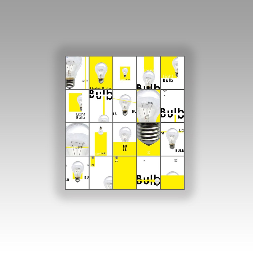 This piece oozes more negative space. The colour block in this piece fills the page. Again, I used part of the bulb rather than the whole image – just because once again I did not want to use “light bulb” twice with the image and text. I emphasised the light and dark contrast again with “light” and “bulb” using bold and regular text. I wanted to keep the negative space so kept everything very minimal and small at the top. The eye is drawn there first and all information is taken in.