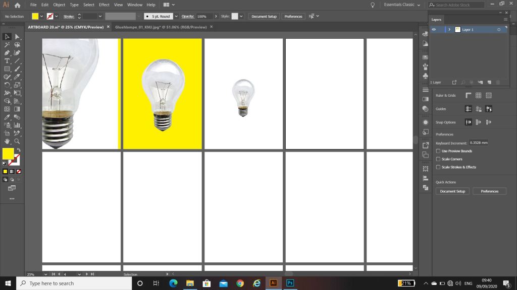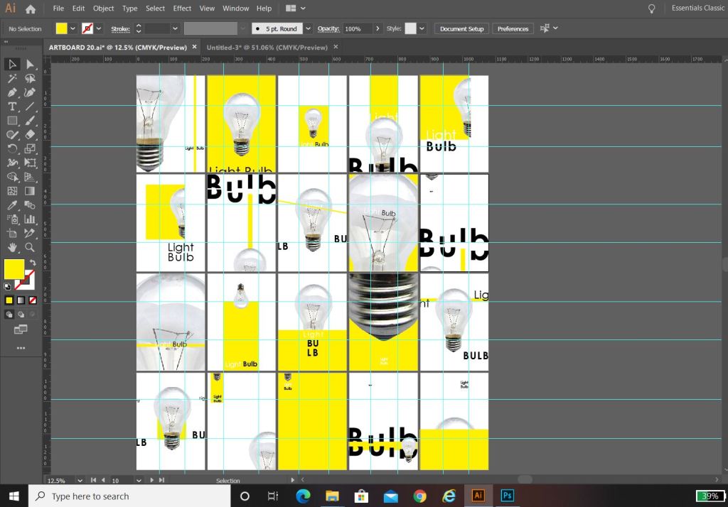 I had my document set up with my 20 art boards and started putting the different elements in place on them, however working with the rule of thirds I decided to create myself a grid to work to. This helped a lot! I found that placing the objects within this grid made the designs have more flow and look more professional.