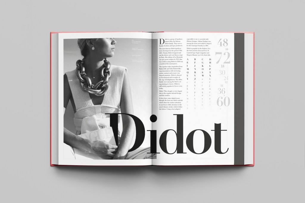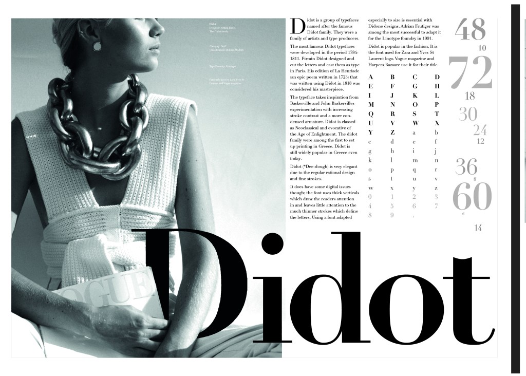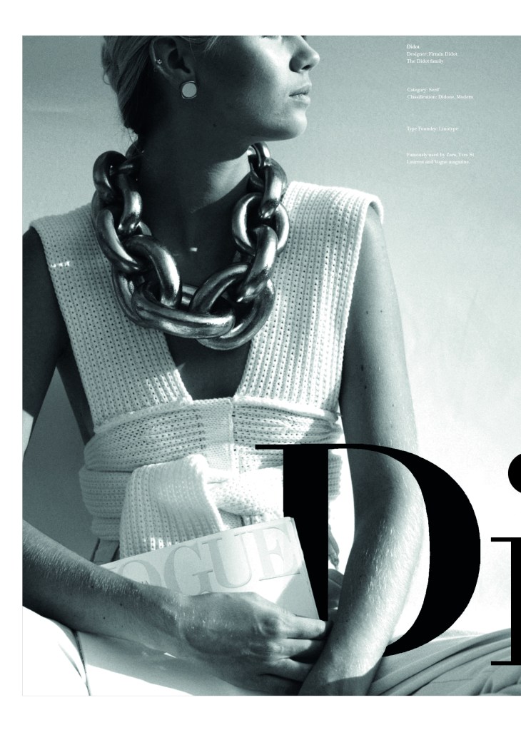 This was the typeface I was quite looking forward to designing for! Didot typeface is very elegant looking and is used in glossy, expensive fashion magazines such as Vogue and Harpers Bazaar. Didot is named after the Didot family who were artists and printers. Didot was inspired by Baskerville which is another reason why I have used it as part of my type specimen book.
