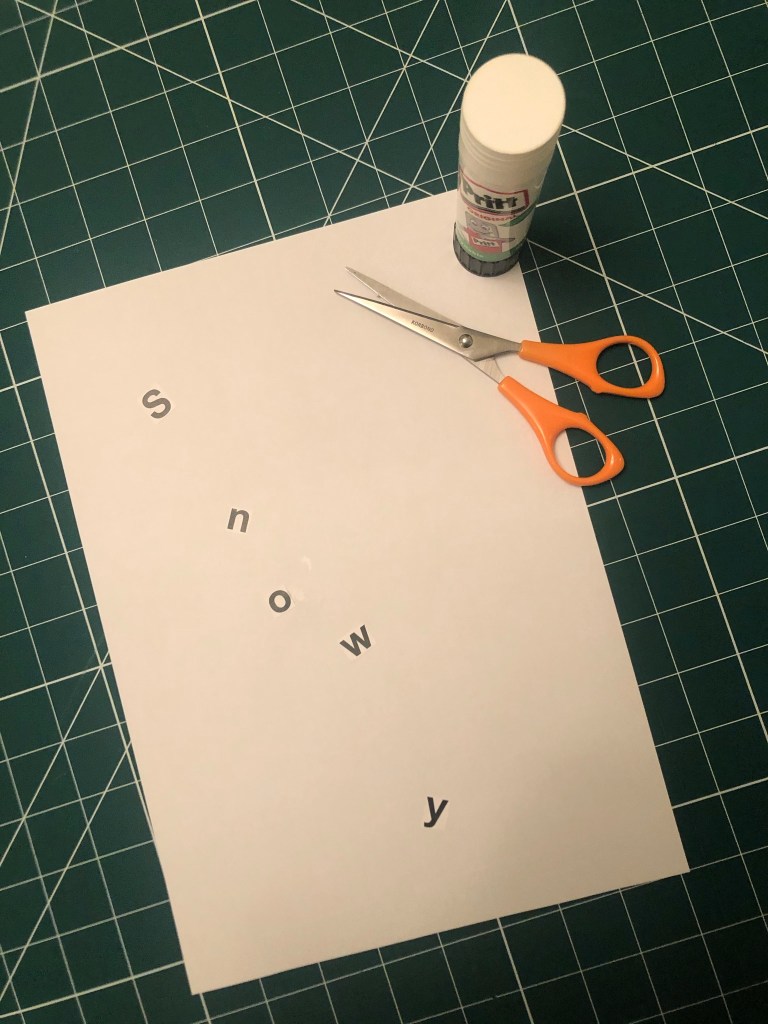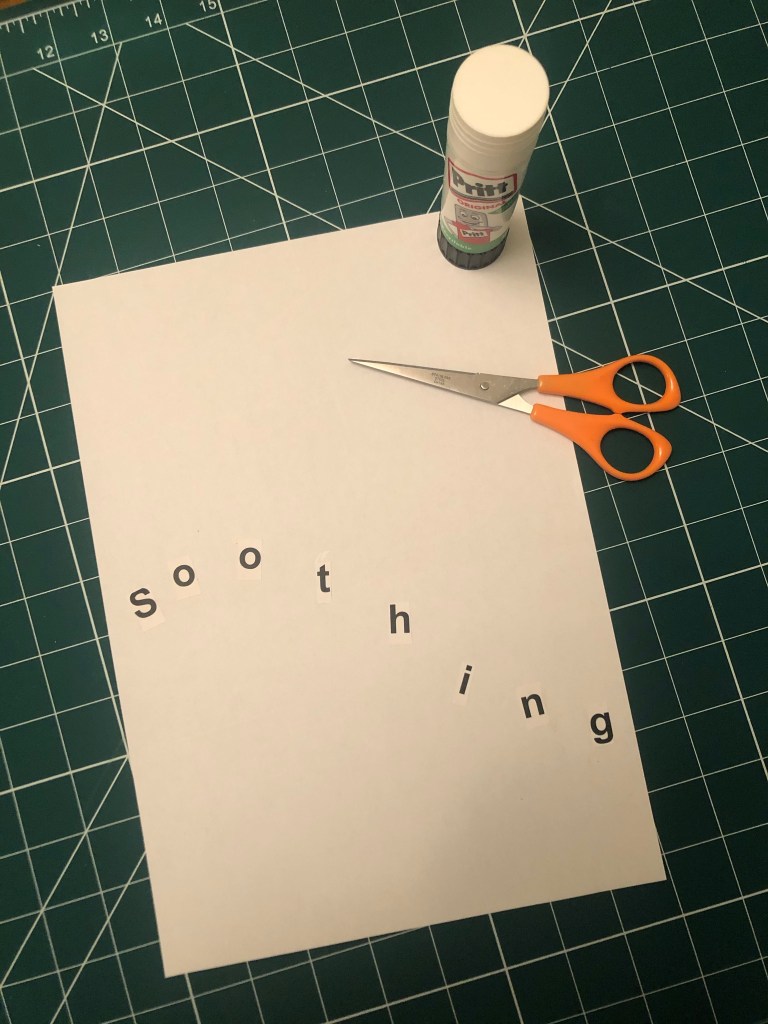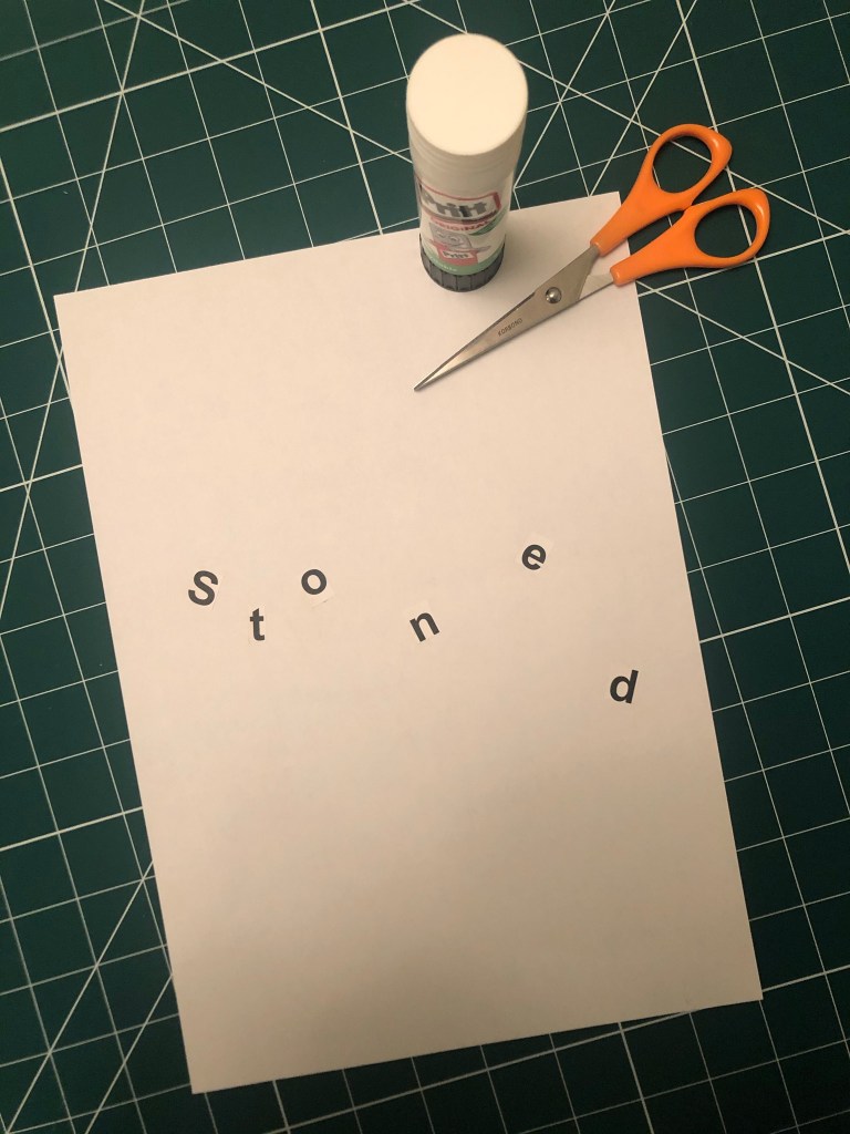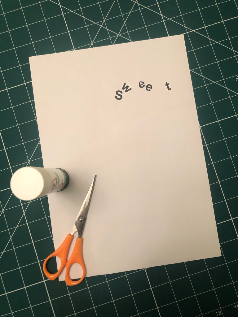 I printed out my sheets using Helvetica and then cut the words up to create my visuals. I used the whole A4 sheet as my blank canvas, I wanted to make good use of negative space and really think about where I was going to place my words within the space.
