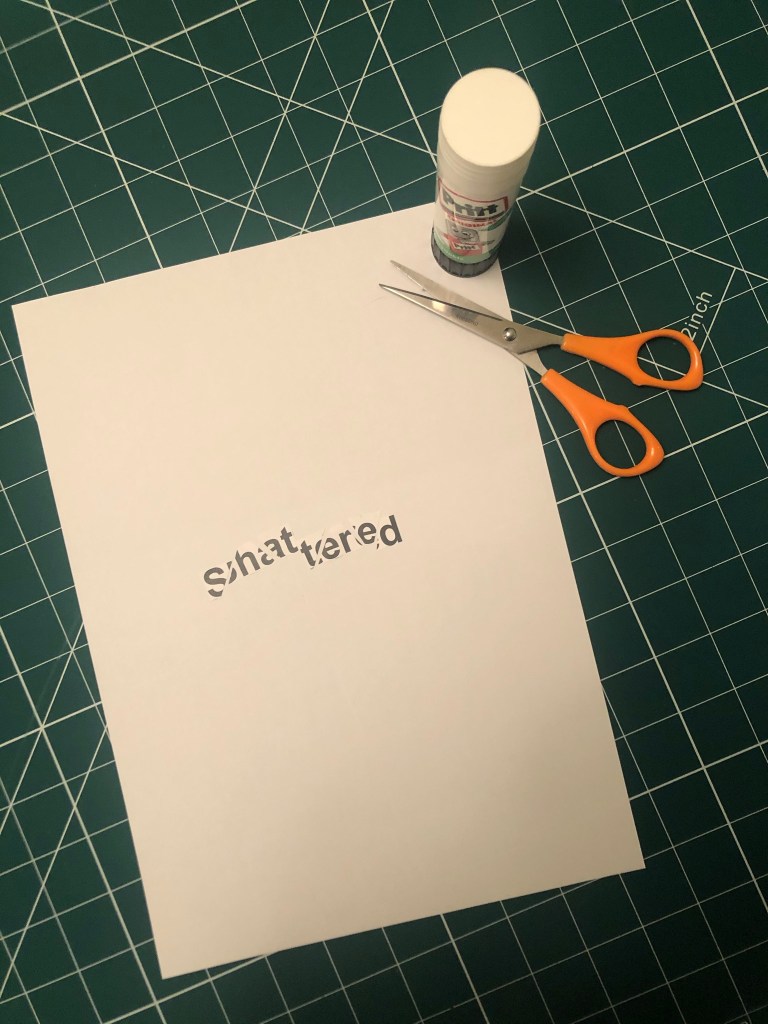 For speed I used the original typeface (Helvetica) and drew around with a fine liner creating a hatched lines to give a “speed” effect. I like the “shattered” one the most. This was created by typing out “shattered” and then cutting chunks of it out using Illustrator. I placed them in such a way to look like it had shattered in the middle of the layout.