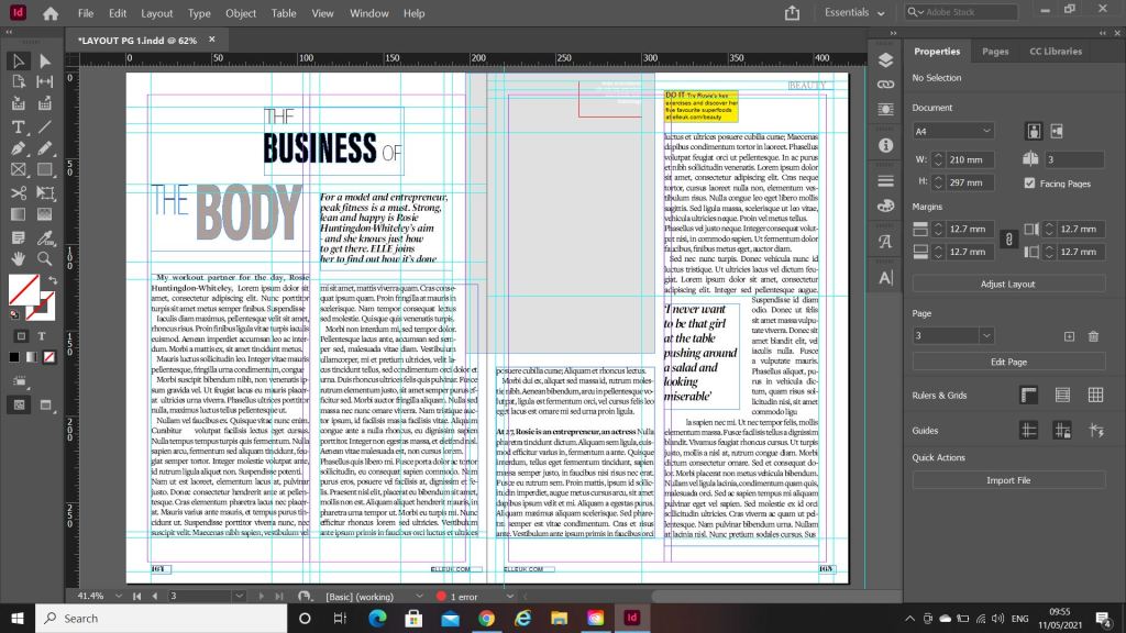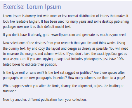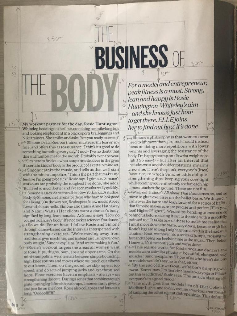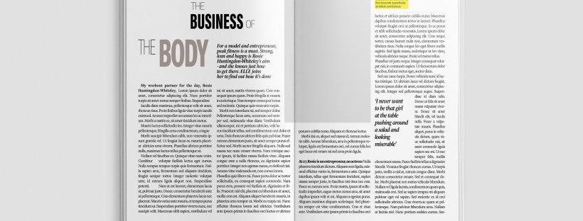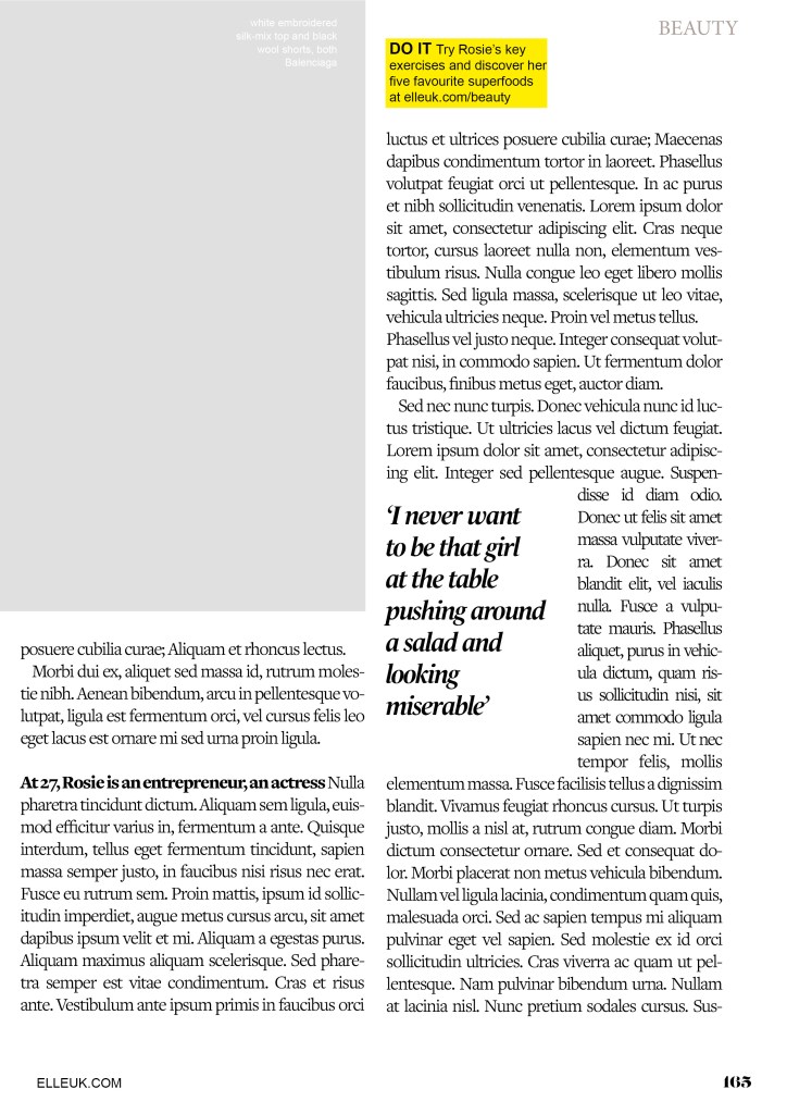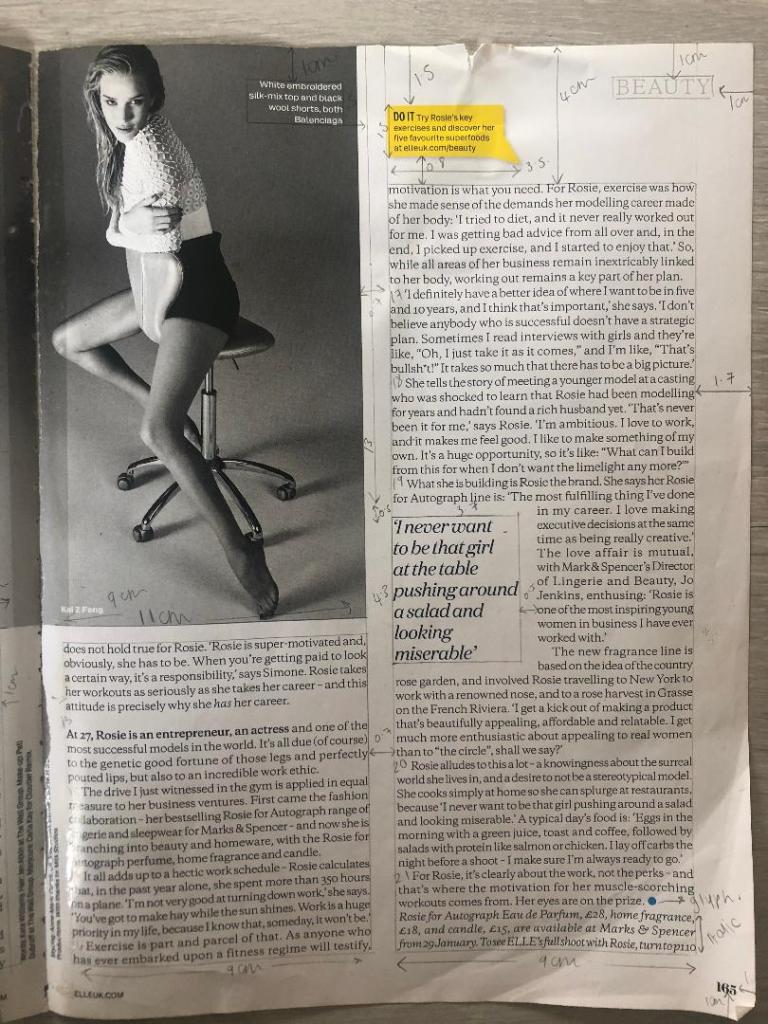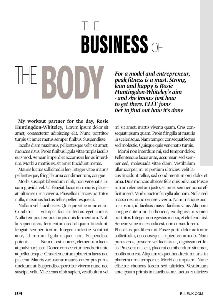 I chose an article from Elle magazine about Rosie Huntingdon Whiteley to copy from. It looked like an interesting article to copy because it has an image, headings, sub headings and uses different typefaces throughout the design. There is also an element of negative space around the title which has been arranged to suit the space. The only thing I dislike about this article is the typeface for the quote below the main title.. I just feel that it closely matches the body text in size and weight. I think that there should have been more contrast between the two typefaces, that the quote should have been written in Bold to stand away from the body text. I want to say that the quote should have used a bigger point size but I think that if the typeface was changed to a bold sans-serif (or even just sans-serif) there would be much better contrast between the two.