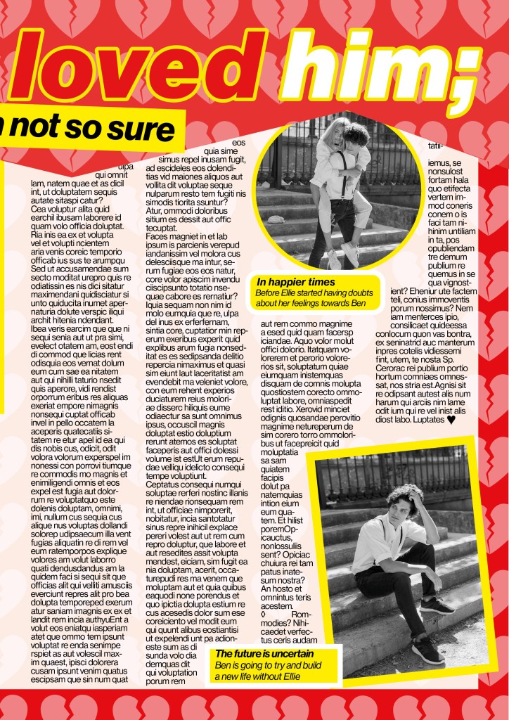 I went to the shop and bought a copy of “Real people” magazine to have a look at some of the layouts in there to see what I could do for my layout. The colours that were used were mostly red, yellow, blue, green, black and white. A lot of the images were placed in chunky, brightly coloured boxes and the typefaces were mostly Sans-serif; again with brightly coloured outlines around the text. The background images behind the layout mostly related to the articles that were being written and that is why for mine I decided to do a broken hearted background. I created this by drawing a broken heart in Illustrator and then repeating it to make a block pattern. I then imported it into InDesign to place behind the text. I then created the zig zag part along the top to represent “broken”. I made the title quite big along the top of the article to draw people in to what the article is about, the “not so sure” part is the second piece of information the reader needs to read so I made that a lot smaller but in white so that it still stands out.