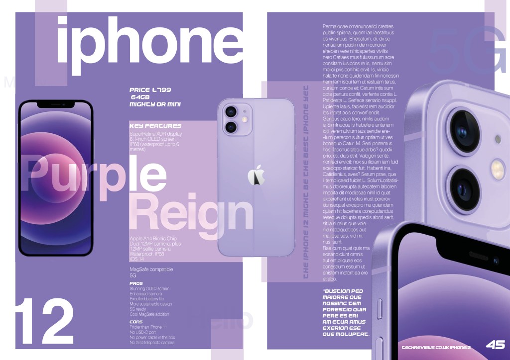I used Lorum Ipsum dummy text for the whole right hand side but added text of my own on the left hand page just so the reader knows what the article is about. I found the key features of the iPhone 12 online and then wrote them on this page.