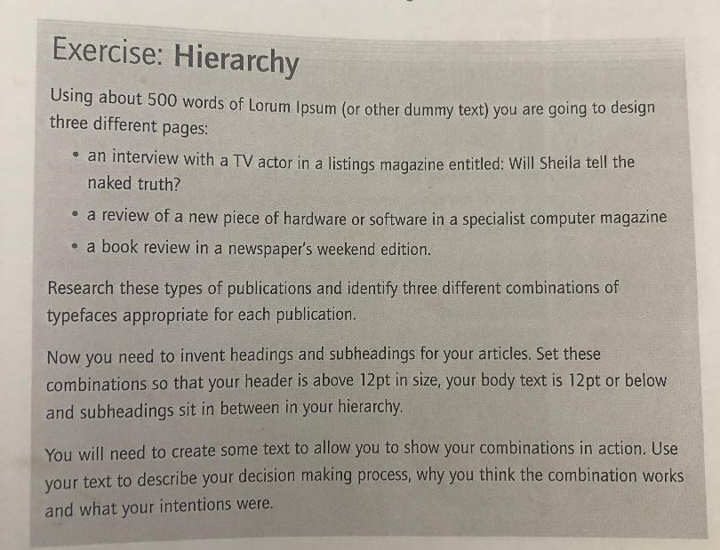 I also used different point sizes for each of the headings, sub headings and body text; I used 12pt for the body text, 90pt for the main heading and 24pt for the introductory paragraph. The rule is when using different pt sizes to make sure that they are at least 3 pt sizes bigger or smaller than each other to allow for that contrast to show. contrast to the design but also it helps separate elements and make it easier to read. Contrast is not just colour – Contrast is also in typography with line widths, point sizes, different styles, Sans vs Serif, bold/Italic/regular etc…