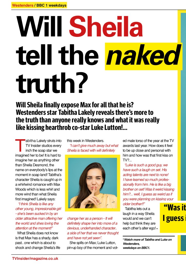 My first task was to find “Sheila”. In my head I imagined a soap magazine where they feature articles about what is happening to the character in the soap that week and then sometimes they interview the actor themselves to get their view on what their character is up to – I went along with this idea for my layout!