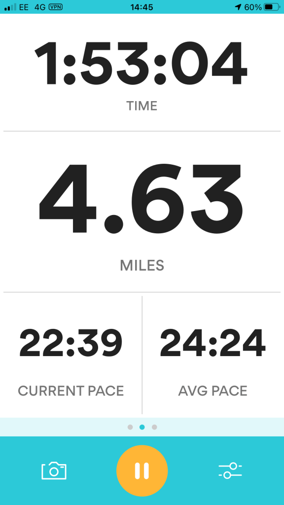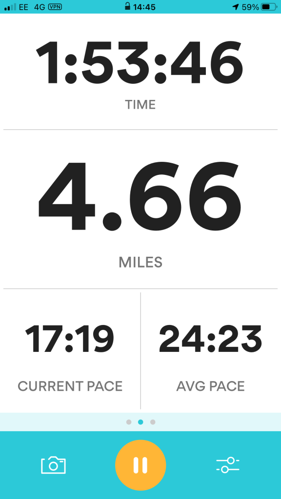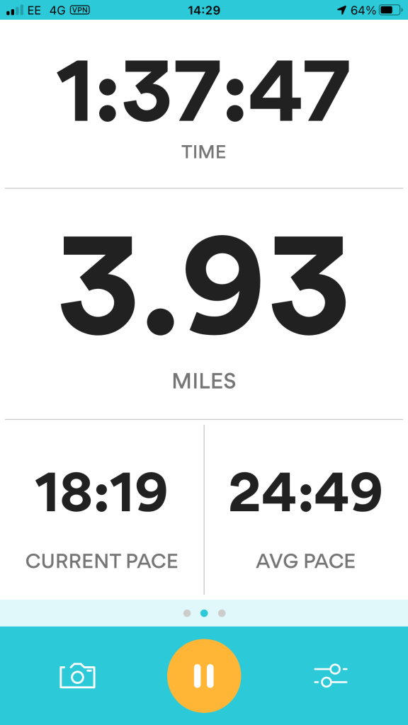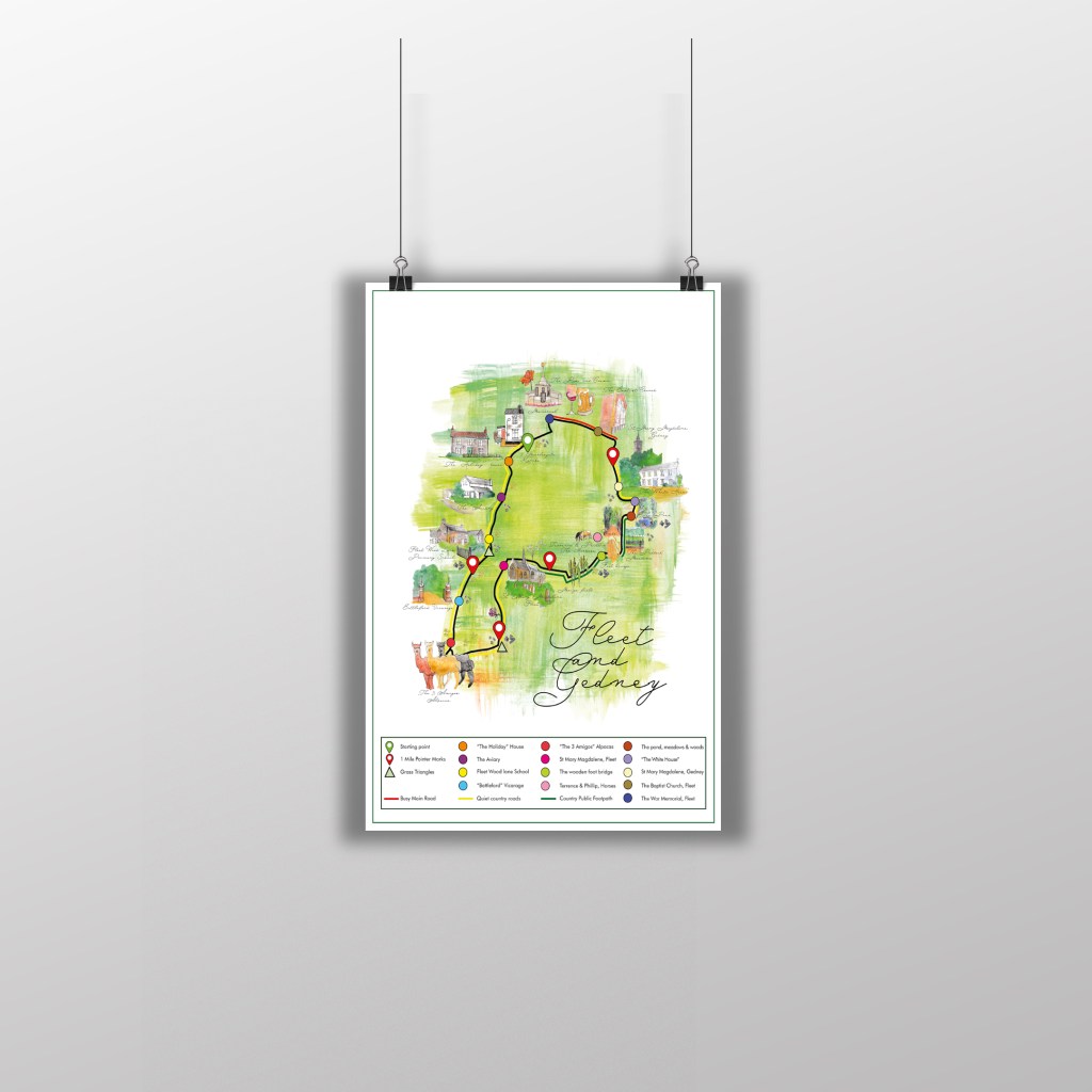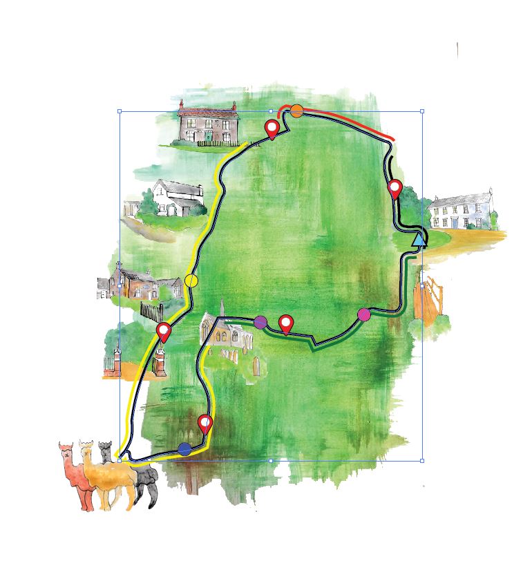 I wanted to do my design in the style of Heather Gatley and knew that I wanted to draw and paint some of the POI of the route and dot them around the outside of the map. I had the Runkeeper app playing in the background of our walk to map the miles and this also gave me the idea for the outline shape of my map, I also looked on Google aerial view to see what colours all the fields were looking down at the route;