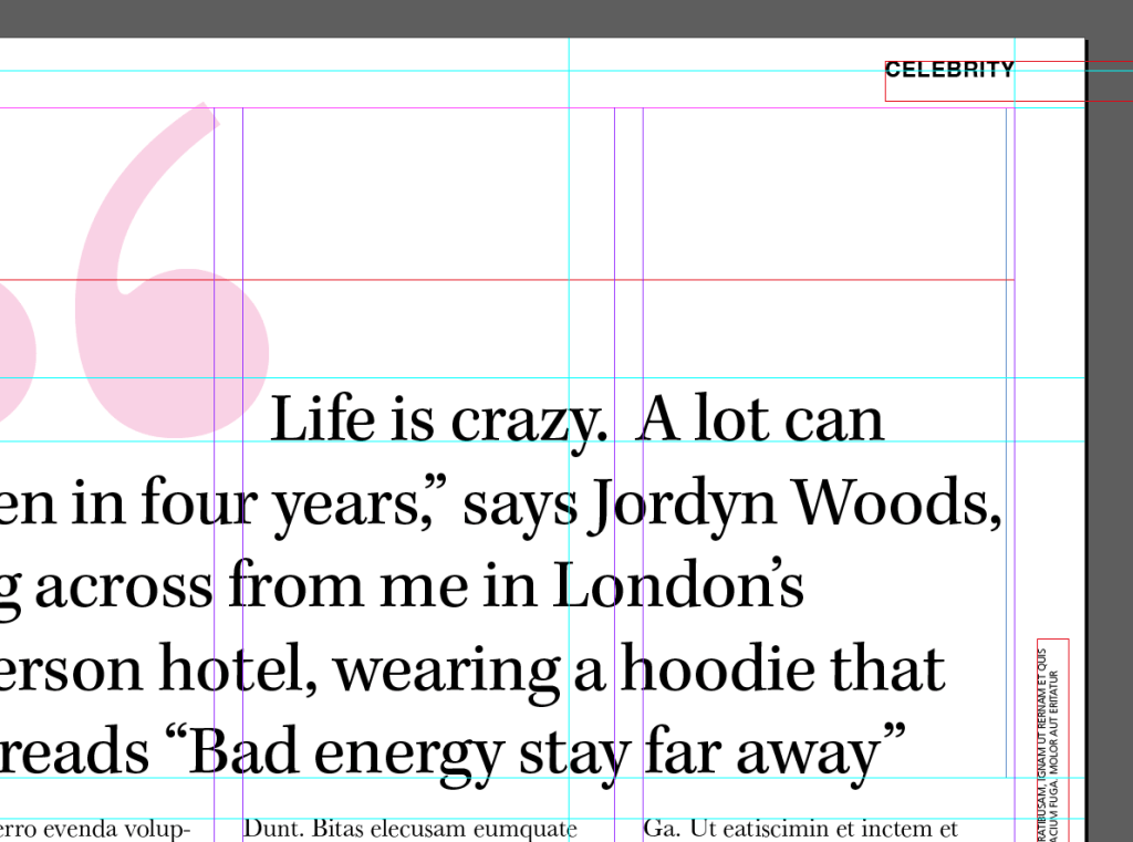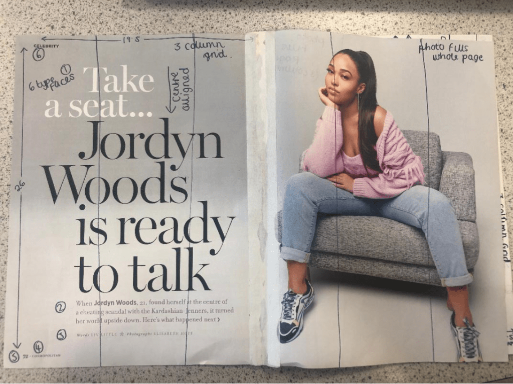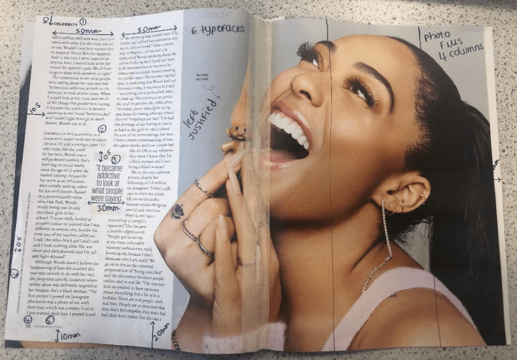 I then went back to my layout and changed the typefaces to what they should be. I guessed that “CELEBRITY” in the top right corner was Helvetica or something similar and the typeface used for Cosmopolitan is Franklin Gothic Book.