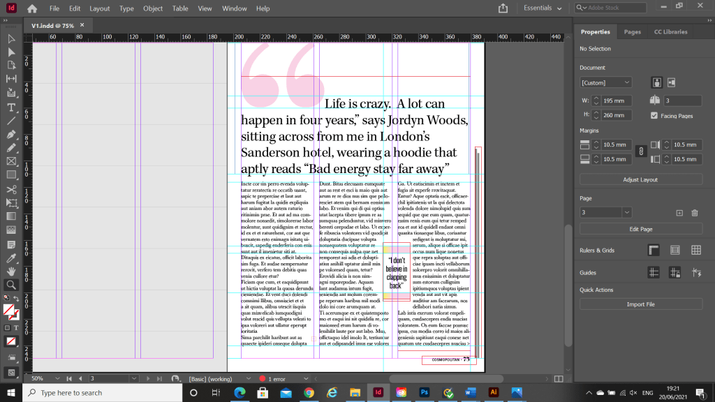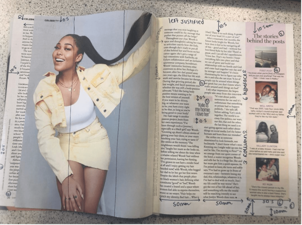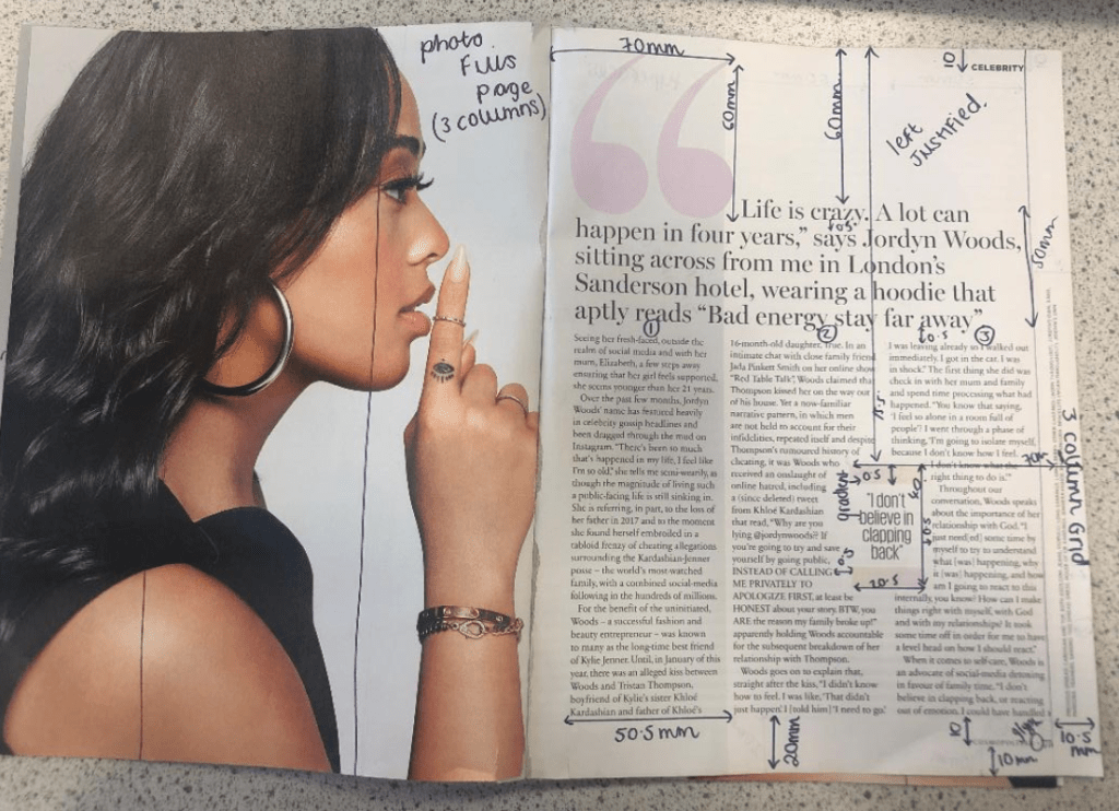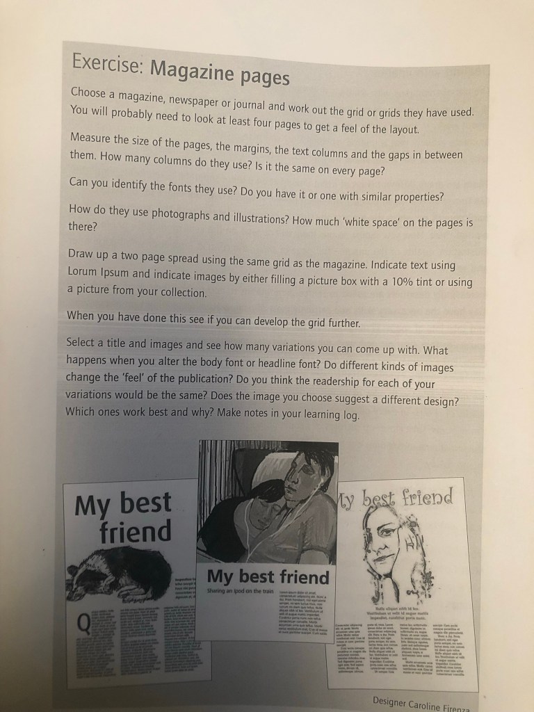 I had a good guess to start with at what the typefaces might be for the headings and the quote and the body text etc… I guessed Didot for the main heading on the page and I used Baskerville as second option for it.. when I used a sample of the magazine to scan into Adobe Fonts that was one of the suggestions for a typeface like it! I am finding that I am finding it easier now to identify typefaces the more I study them and look at them. I had no idea what the typeface was used in the tiny pull quote box in the middle of my layout though, I knew it was condensed; it looked like Meta but it was too light and the bowls on the b, d and p were too big and the stems too short.