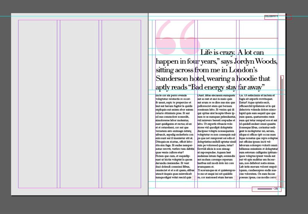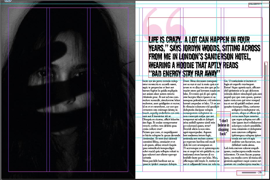 This layout does not match this type of article at all. The pink colour does not match the dark theme and the layout is too calm and friendly and serious for this image. With this image I would expect to have big, bold, dark type as headings (possibly filling most of the page) I would expect a Sans-serif for the main text too because Sans always comes across as not having much of a personality – it can look quite cold and unfriendly in appearance. I imagine that readers who read Cosmopolitan would not be reading this article!