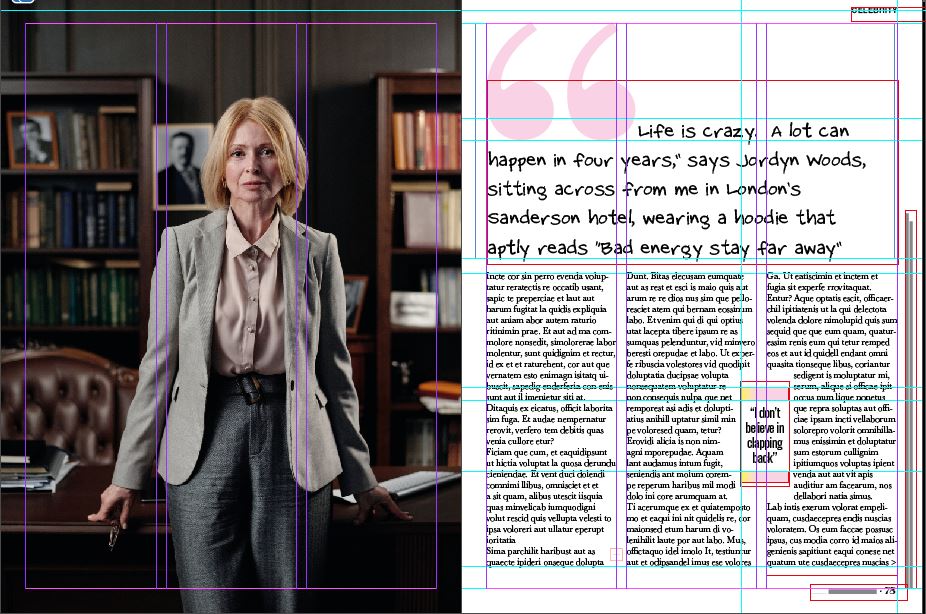 I have switched it up again by using a professional serious image and a fun, gimicky, childish typeface. The typeface is not professional at all and does not reflect the feel of the layout or of the image. The image and the grid layout are similar to what you would find in a country magazine or a posh glossy magazine such as Harpers Bazaare but the typeface, the speech bubbles and the pull quote just do not match the feel of it. The rest of the magazine article is less serious and would suit a gossip/fashion magazine more – a magazine that isn’t political or have a serious audience.