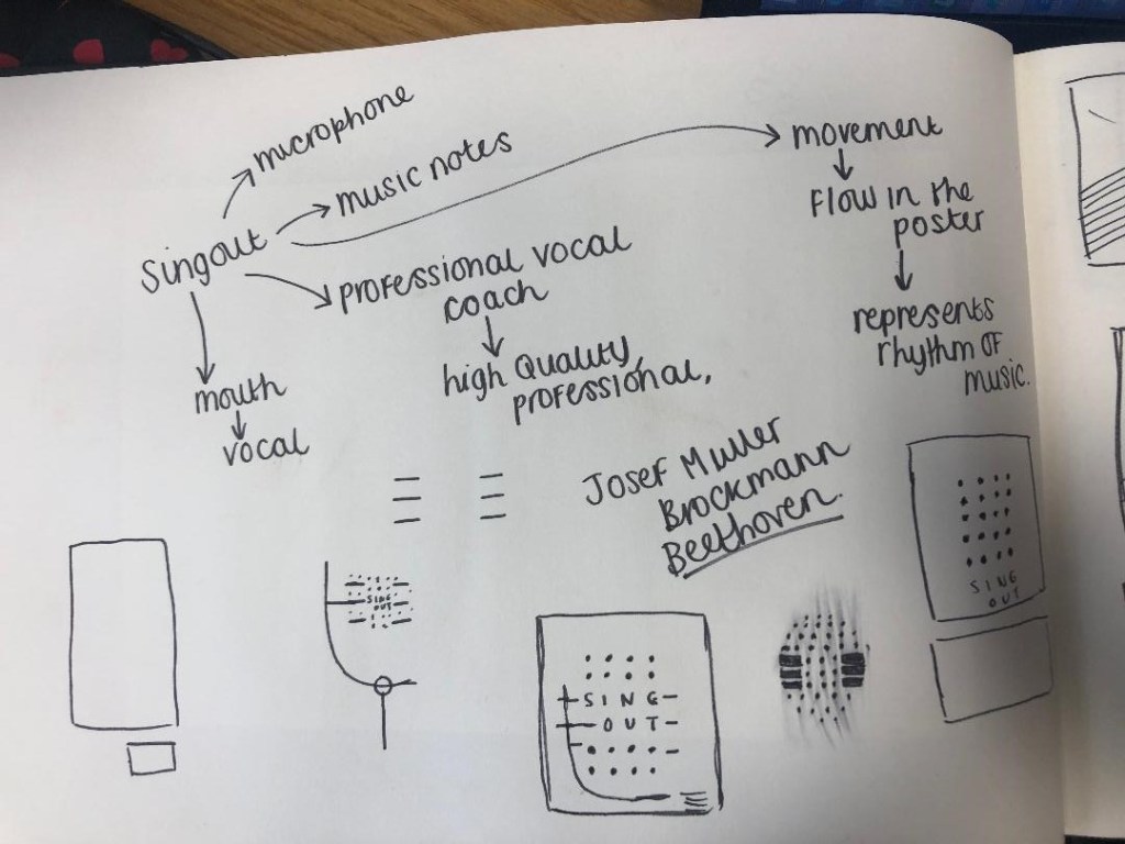 I started to sketch up ideas very similar to this poster in my sketchbook. I used a microphone as the main image and tried to simplify it down to its basic form to create a similar effect to what is seen in Josef Muller Brockmann’s posters. I was trying to find clever ways of making negative space the main design instead of using actual images, illustrations or photographs.