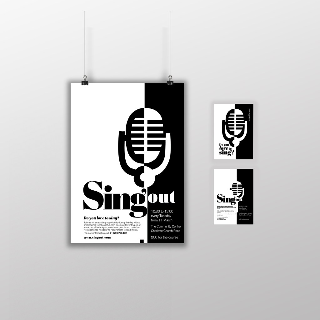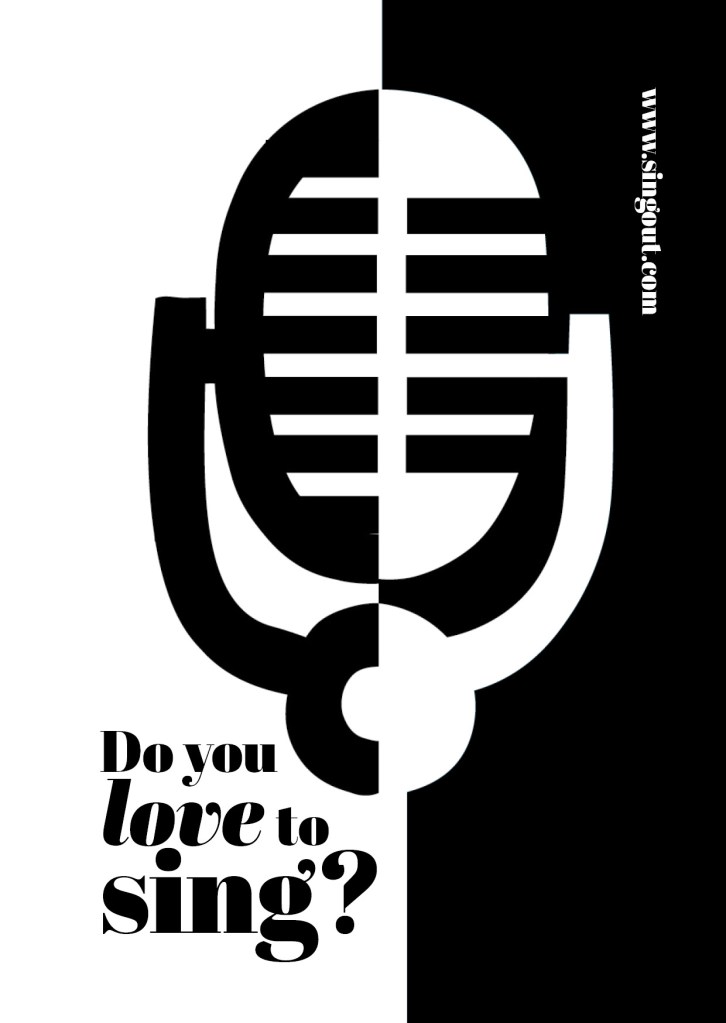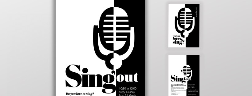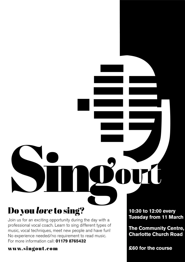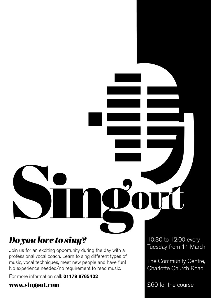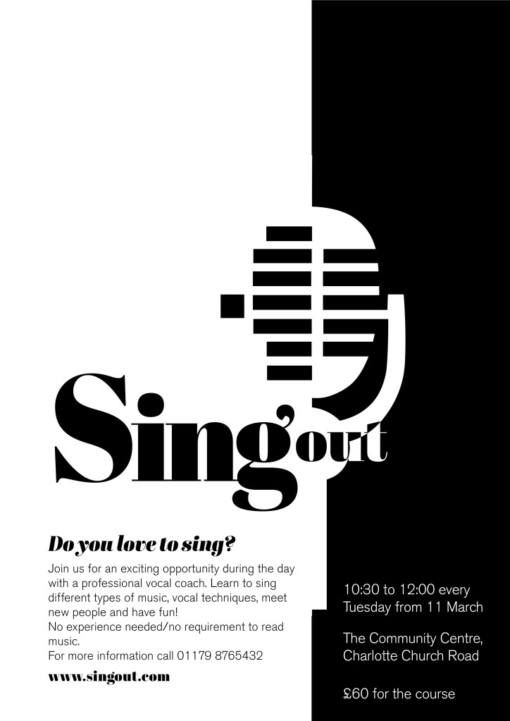 I messed around the most with how to display “Singout” – all one word! This was a challenge also! I decided to make”Singout” 2 different sizes but still one word for 2 reasons; 1) for contrast 2) to separate the word up but still keep it as one word. I placed the “o” in “out” in the centre of the microphone on some of the layouts as I felt it would make it look part of the design, however it changing the colours in “out” looked too confusing and was not legible at all.