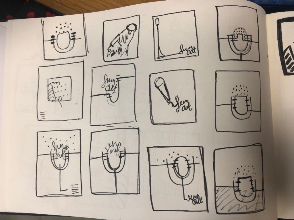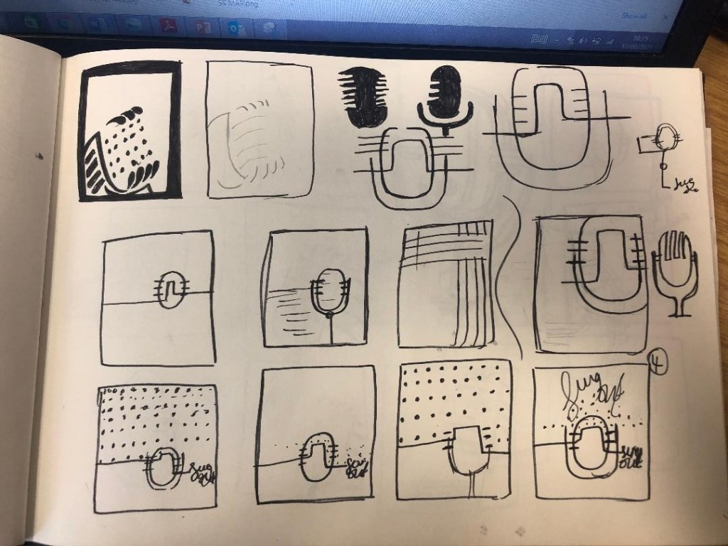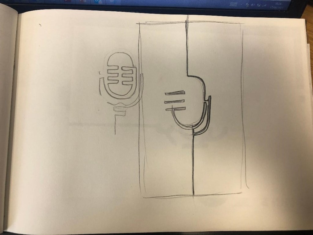 Trying to create it proved too difficult though, I was only using a section of the microphone and because of this I struggled to get the design to still look like a microphone. I also struggled to make the text a part of the design because it would have looked too small and not stood out at all. I went back to the drawing board and started with new ideas…