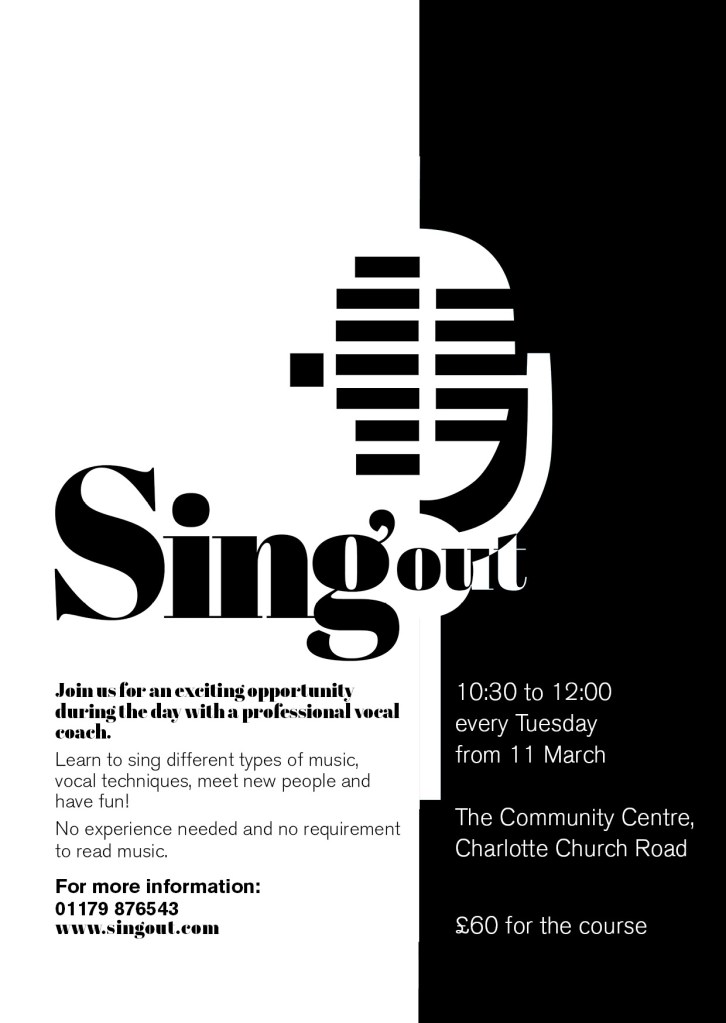 Singout as 2 different sizes for contrast an legibility. “Sing” is seen first as the vital information and then “out”. It could also represent being smaller for being “on its way out”. I used the same typeface for the sub heading of the poster and also for the website. This typeface is a serif which does not make it an ideal typeface for body text. The rest of the information I used Berthold Akzidenz Grotesk. It is a Sans-Serif typeface which makes it ideal for important information that needs to be read as it is clear and legible.