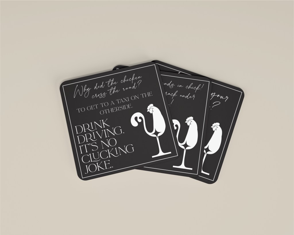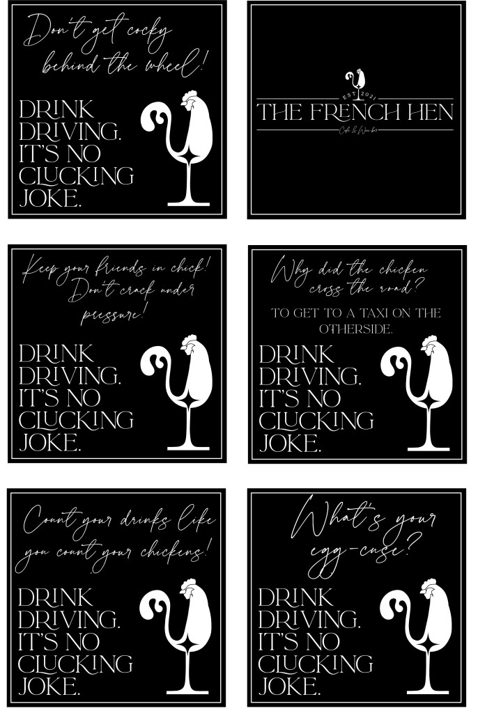 I created 5 different styles so that in the bar there could be lots of the different versions on each of the tables to compare. They feature a joke or a witty slogan all relating to chickens but with a serious drink driving message on them. I have kept them all to look like The French Hen branding.