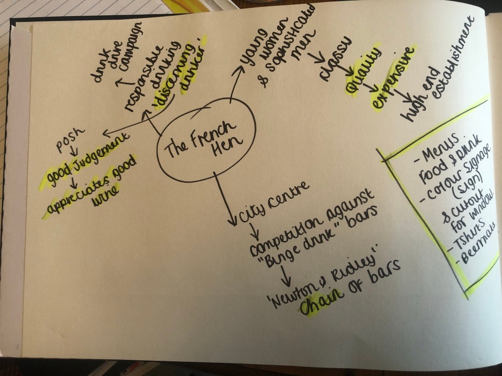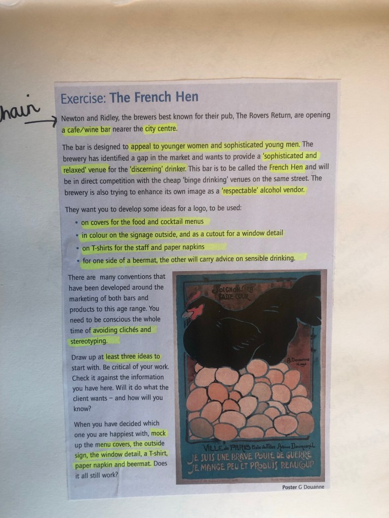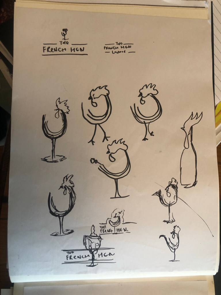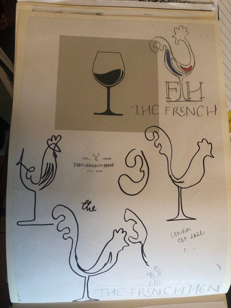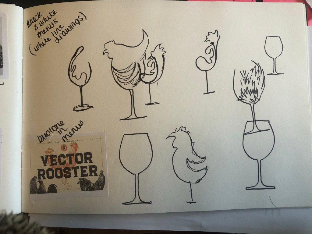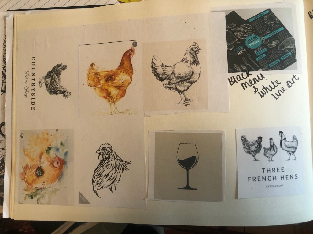 I then wanted to look into Hen designs to see what I could do for my own logo. The black and white illustrations of Hens that I found looked like they would belong in a homely “kitchen” style restaurant. There is a restaurant called “The Kitchen” near me in town which is very shabby chic and country inside – I used their menu as part of my research in my sketchbook. I really like the watercolour hens but they are what would have to appear in the menus or on place mats and the decor of the wine bar because they would not make a very good logo.