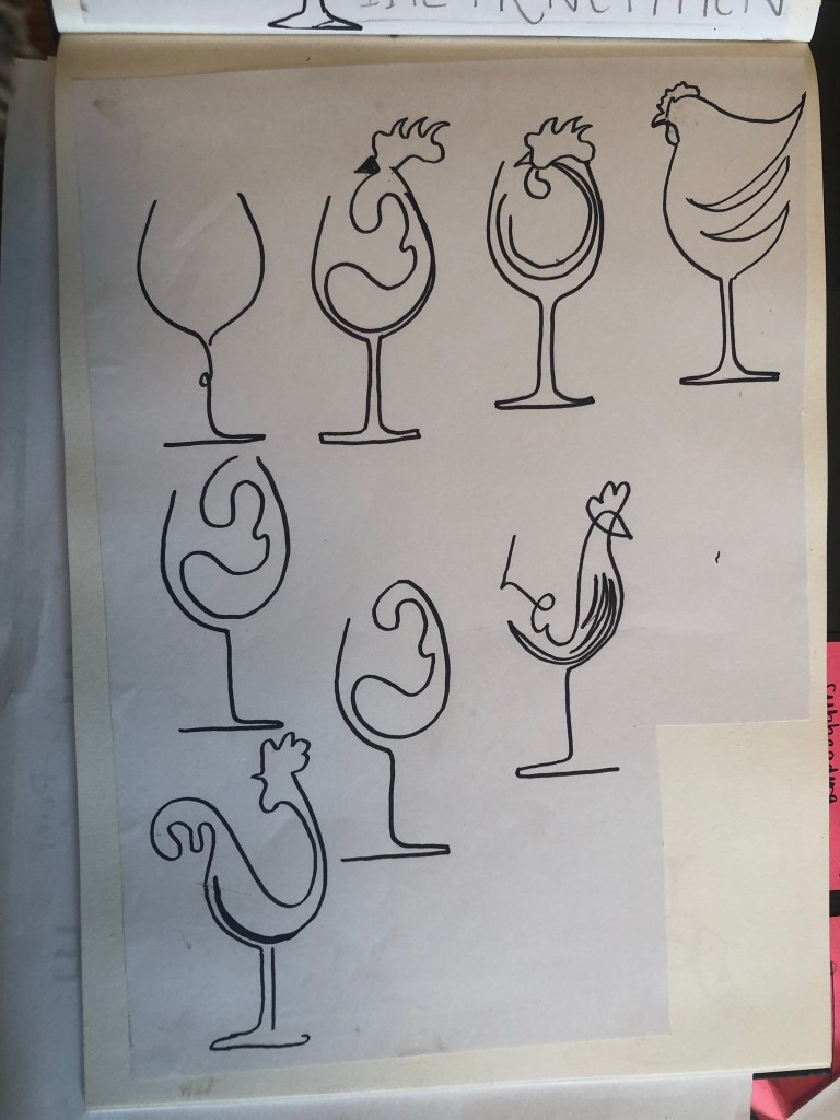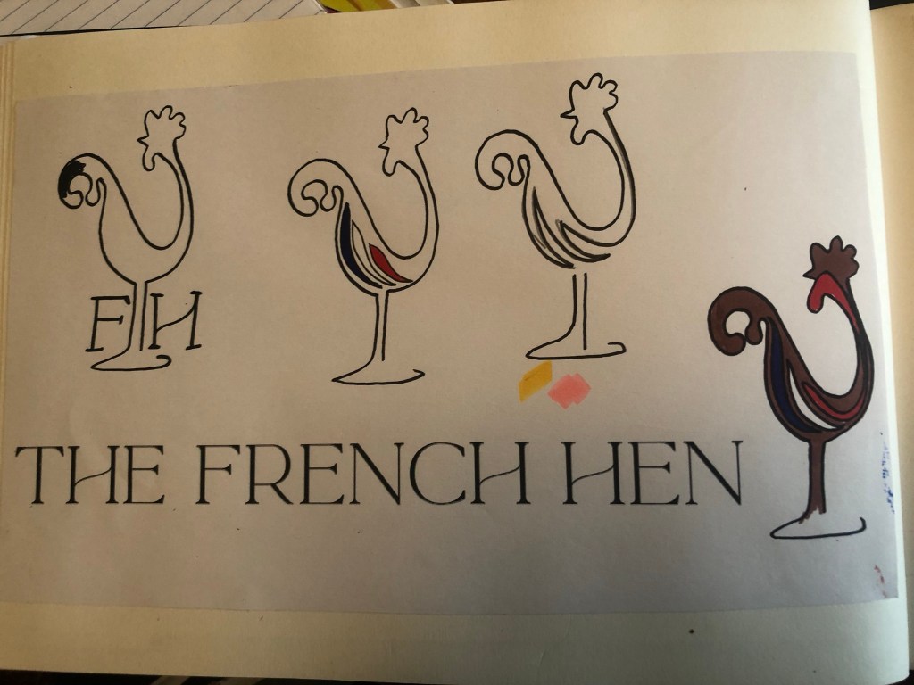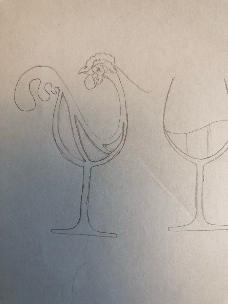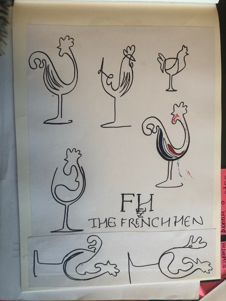 The idea of my drawing is that the French Hen morphs as part of the wine glass. The hens tail also represents wine spilling out of the glass