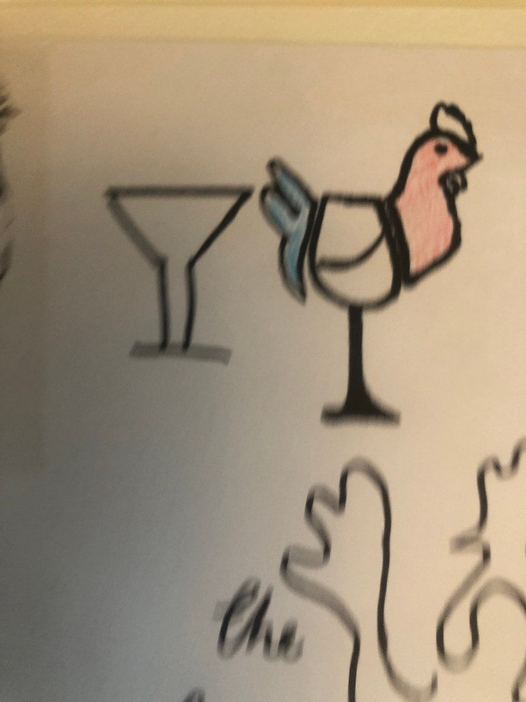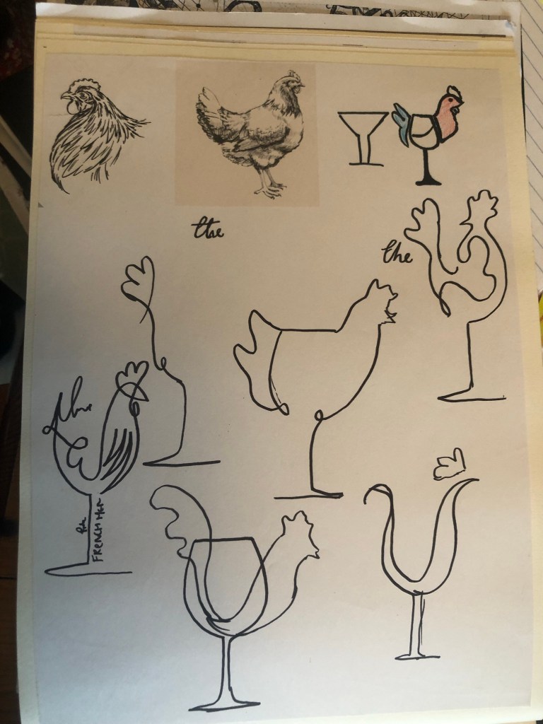 The Hens face was questionable however ! She also looked more like a Turkey! – I later did my research and realised that Hens do not have a big waddle like the one I have drawn… she was more like wine drinking Rooster-Turkey at the moment!