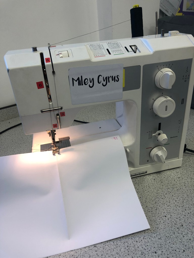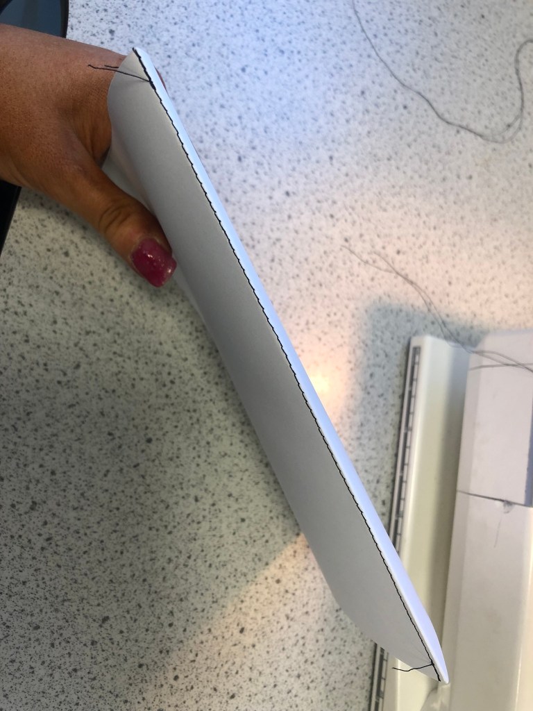 I then had a go at stitching the spine; my job in Design Technology in a secondary school means that I have subject knowledge also of Textiles. Using one of our trusty Bernina machines (Miley Cyrus – yes! we name our machines after pop stars!) I stitched down the middle of the inside spine. This method is so quick and easy and a much stronger method than the stapler. It just depends on whether or not people have access to sewing machines for this method. This method of binding would be cheaper than using staples, a reel of thread goes a long way and would be able to stich a lot of spines; working out a lot cheaper.