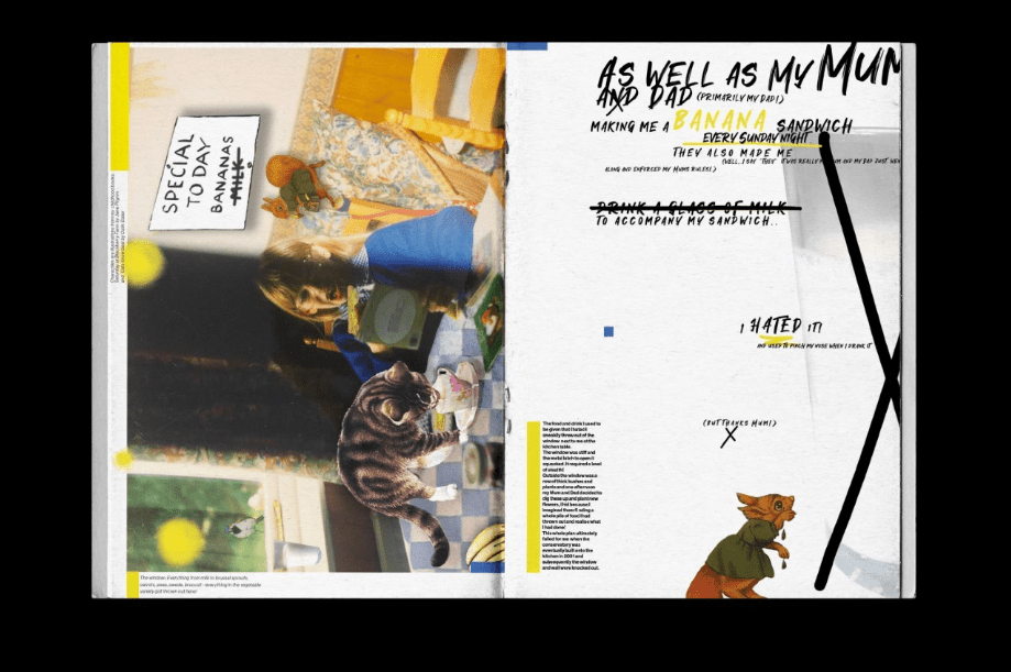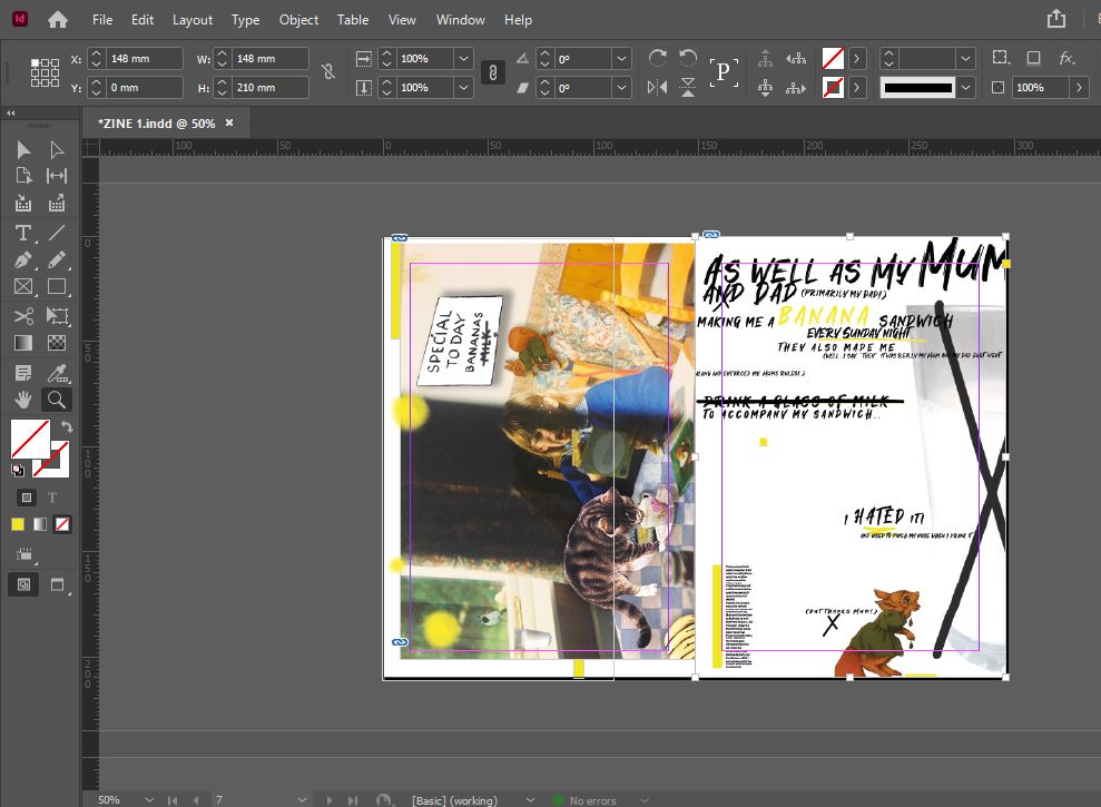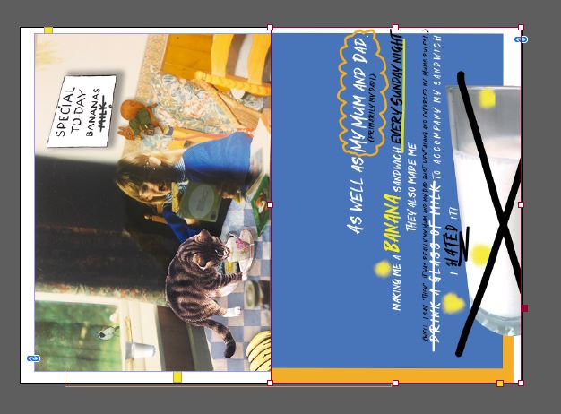 The narrative for the cover of the zine is “Don’t judge a book by its cover” and I have explored that through the use of my food combination- Banana sandwich; In a few pages I went into more depth with this subject explaining what significance it has to me personally and to link it to the subject of books and in particular my childhood books.