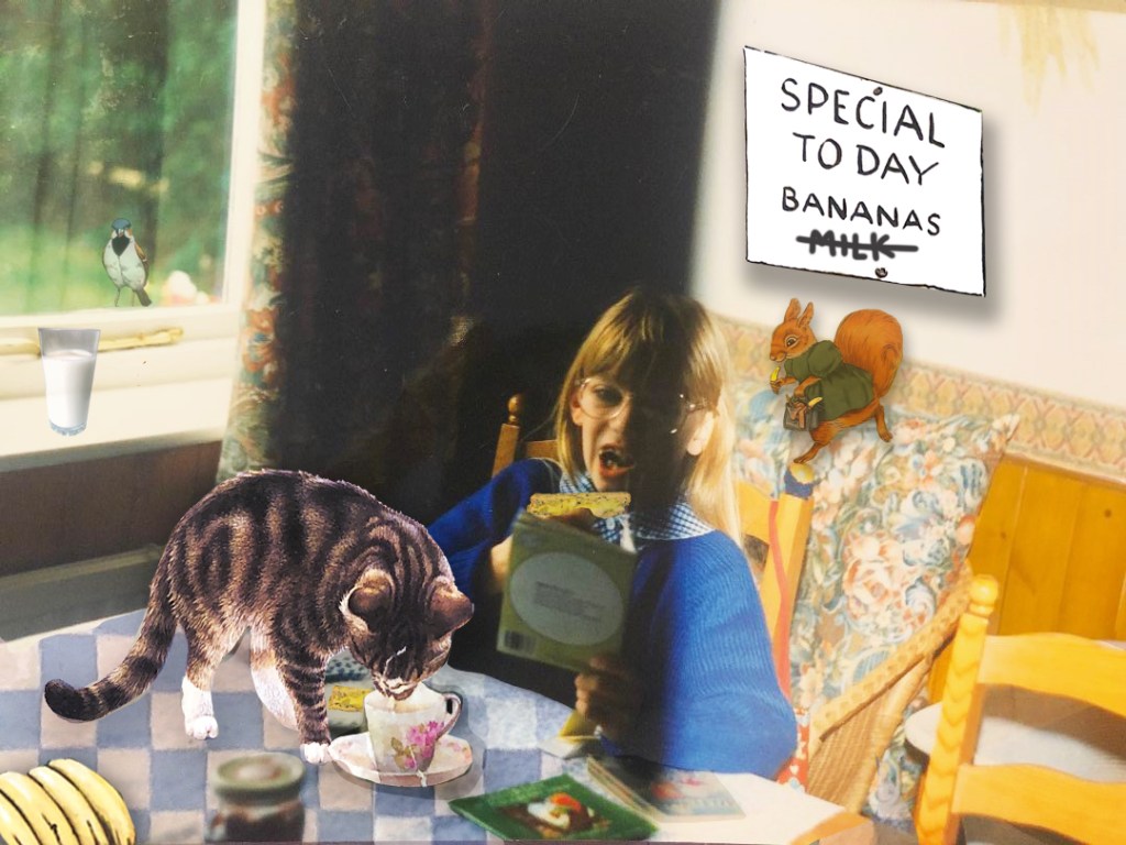 I took the photo and collaged into it a collection of images taken from some of my childhood books which reference bananas and milk; “Saturday on Blackberry Farm” (which references Milk and Bananas) and “Cats know best” which relates to milk.