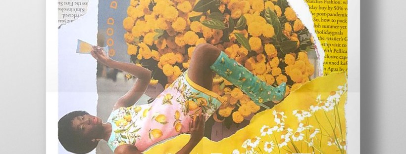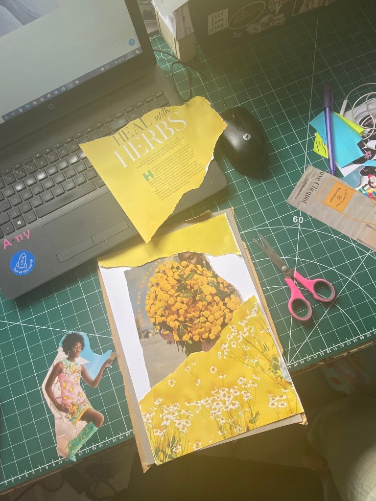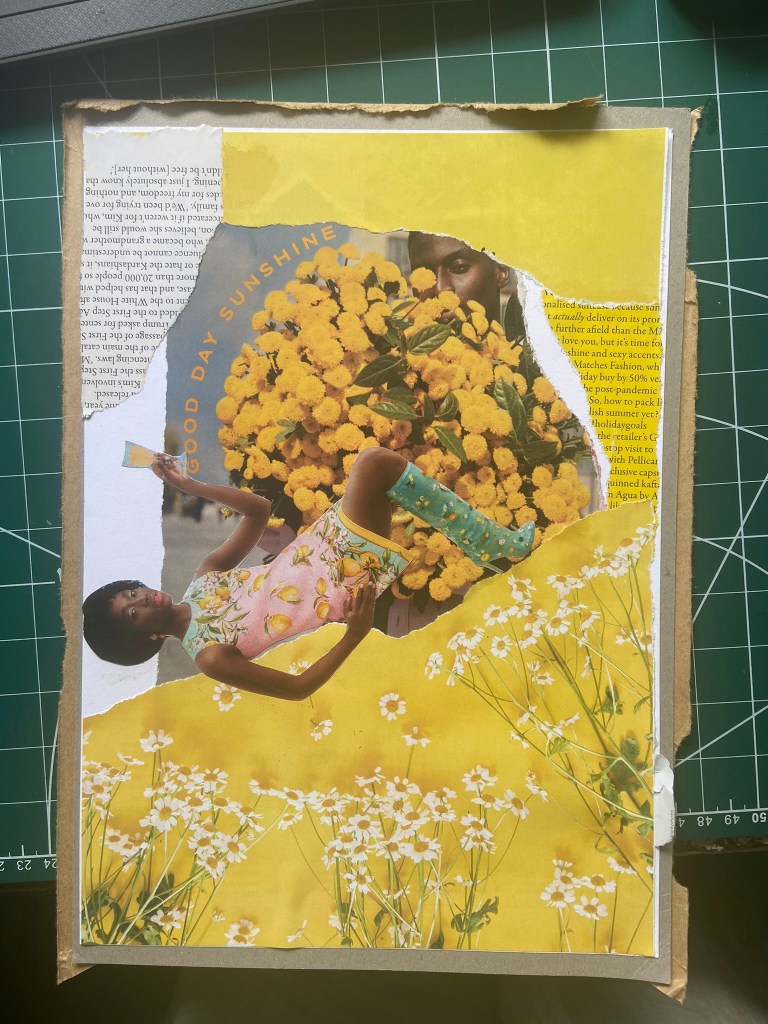 I got this bag out again to see what I could come up with for some experimental collages for this exercise. I also had some old fashion magazines that I used. I found some bright yellow summery layouts in the fashion magazines – a lot of material based around lemons! With the cuttings I found I decided to make some sort of story out of them…