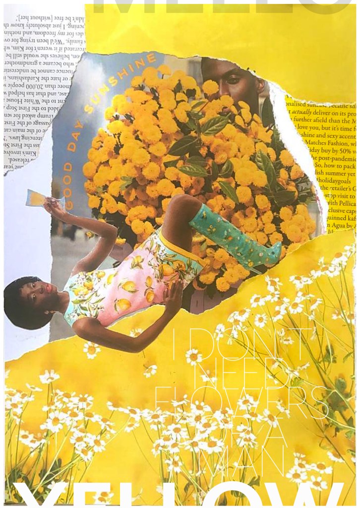 There was an advert of a man holding some flowers and looking all shy behind the bouquet and then I found a clipping of a woman all dressed in lemons and yellow and looking very chilled out and relaxed drinking a glass of something alcoholic! The woman looks way too self involved to want the man or his flowers and I played on that in the text I use “I don’t need flowers or a man”. I wanted some kind of balance to the piece and that is where I used the bottom clipping of the flowers but also used another part of that to go along the top. I did the same with the clippings of text I found.. I placed them across from each other on the layout, it just made the hierarchy look much more balanced out. To add some contrast to the piece I added the larger text for the main title “mellow yellow” but changed the opacity at the top so that yellow stood out much more.