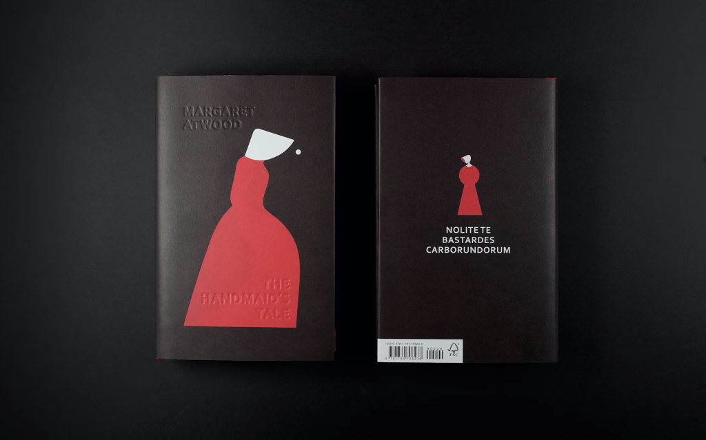 I really like the above design for The Handmaids Tale. The textured cover with the embossed title and the simplistic design that clearly portrays the handmaid in her white bonnet and Burgundy dress. The back cover is a keyhole that has been played into the image of a woman- this symbolizes the woman’s imprisonment. It is very simplistic but well thought out. It makes you stop and think and understand what is happening in the design and to then eventually find out what the story is about.