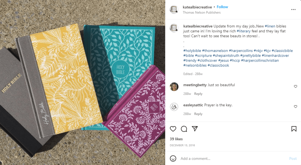 I had a look on Kates Instagram to see what other work she has done and by looks of it she does a lot of hand lettering, book cover design and Bibles!… She works for Harper Collins Christian.