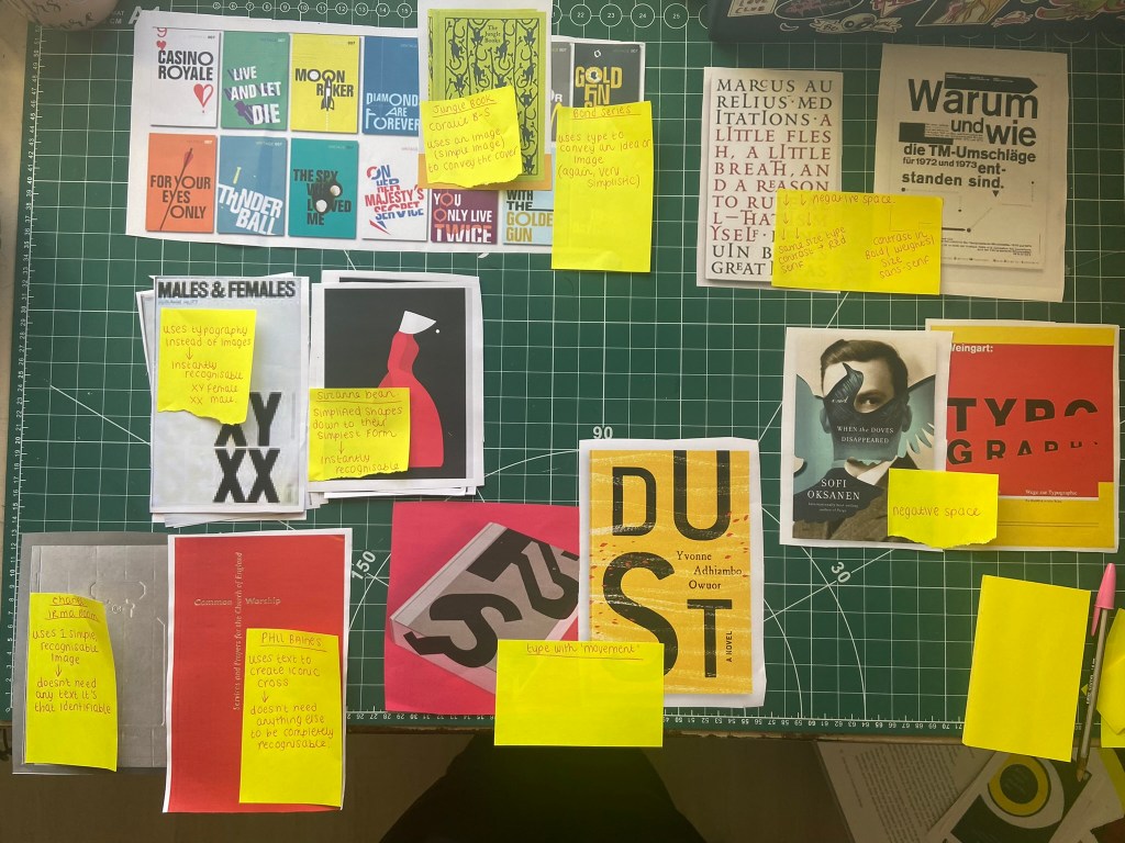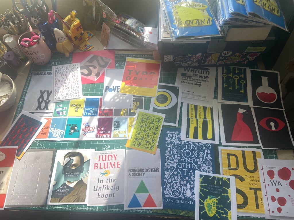 I first decided to print out some of the covers and lay them out on my desk to see which ones contrasted and compared: