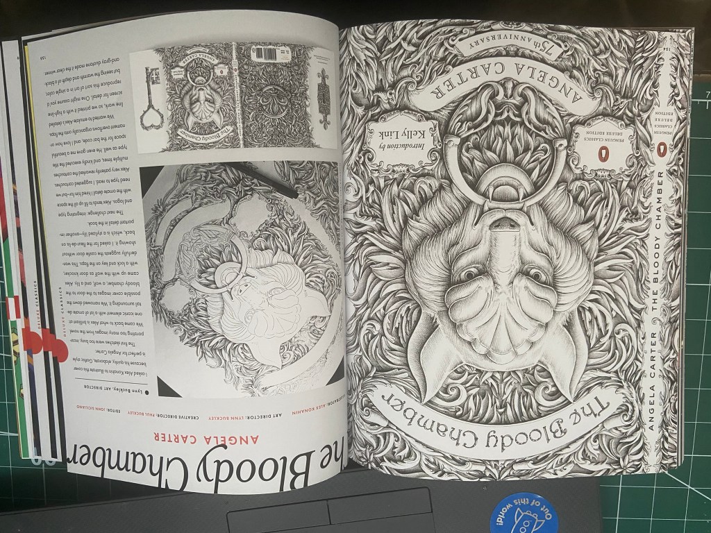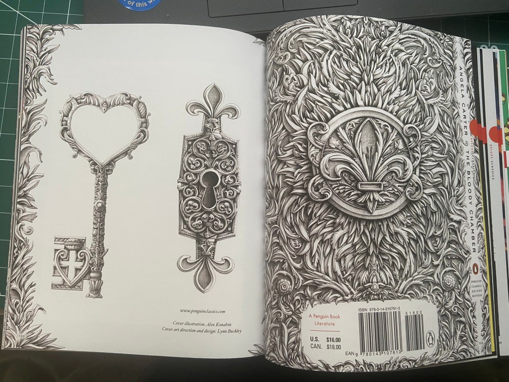 I came across some of his work again, in the Penguin classics book. He designed a cover for The Bloody Chamber by Angele Carter and it was all ink drawn and absolutely amazing! I love ink drawing- it is something I am good at but only wish I could be even better at! The back cover design for this book reminded me a lot of what I drew in my zine for The Secret Garden double page spread I did, where I did an ink drawing of a lock. His drawings are phenomenal though in the attention to detail and the amount of work that has been put into it! – There is something about Black ink drawings that is so special; it makes the piece look so deep, thoughtful and beautiful!