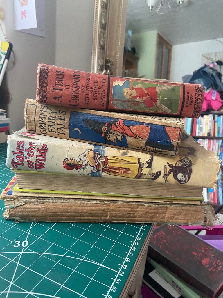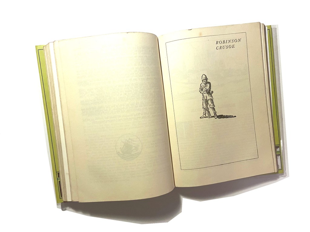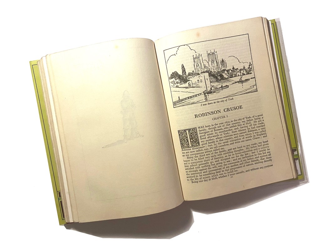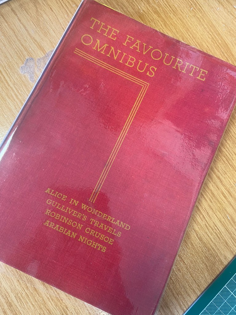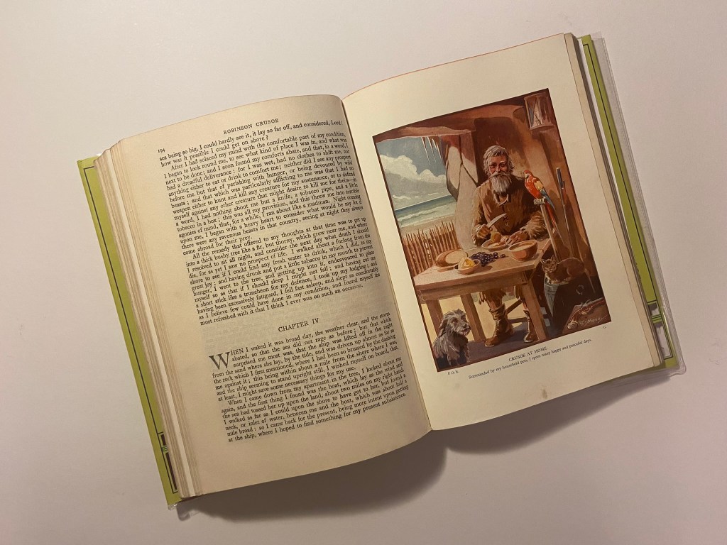 I started to research first, obviously I knew who Robinson Crusoe was and I knew vaguely what the story is about but I didn’t know enough to be able to design two books. About a week before I started this exercise my Mum had some old books that belonged to my Grandma and Grandad when they were children which she no longer wanted and didn’t have room for. For the purpose of this course and because I didn’t really want to lose them, (there’s that sentimental feeling that books give you! – trying to keep hold of them as they are heirlooms and hold their own story and history within their own right!) I took them off my Mums hands. One of the books was a thick, red, cloth bound omnibus of adventure stories of which included Robinson Crusoe which was a bonus! From first glance at the brief it states I needed to mock up my covers; I usually do this in a digital form by finding a book mockup online and placing my designs onto it. I thought this time though it would be a good idea to mock up my design onto this actual book! – it would then hold even more stories and history; firstly that it was gifted to my Grandma for being a good student at school and secondly it would have a new cover designed and made by her granddaughter 70 years later – my grandchildren might hold onto this copy and try and figure out why I designed a new cover for it so many years later! You never know, they might be artistic and add their mark onto it too!