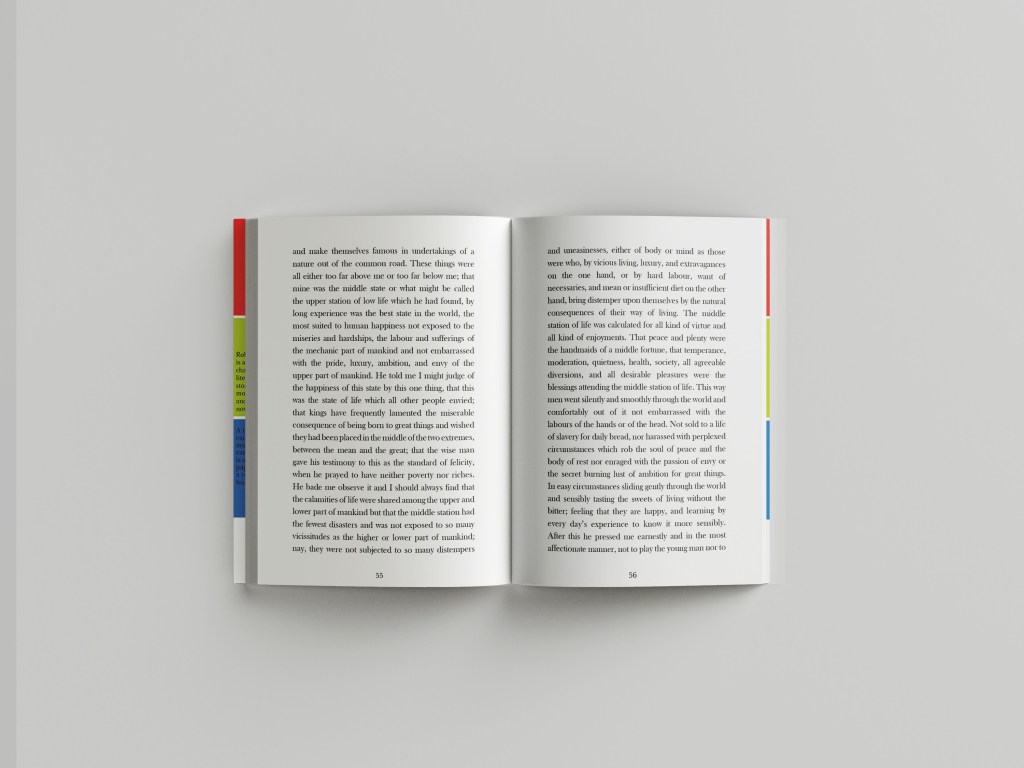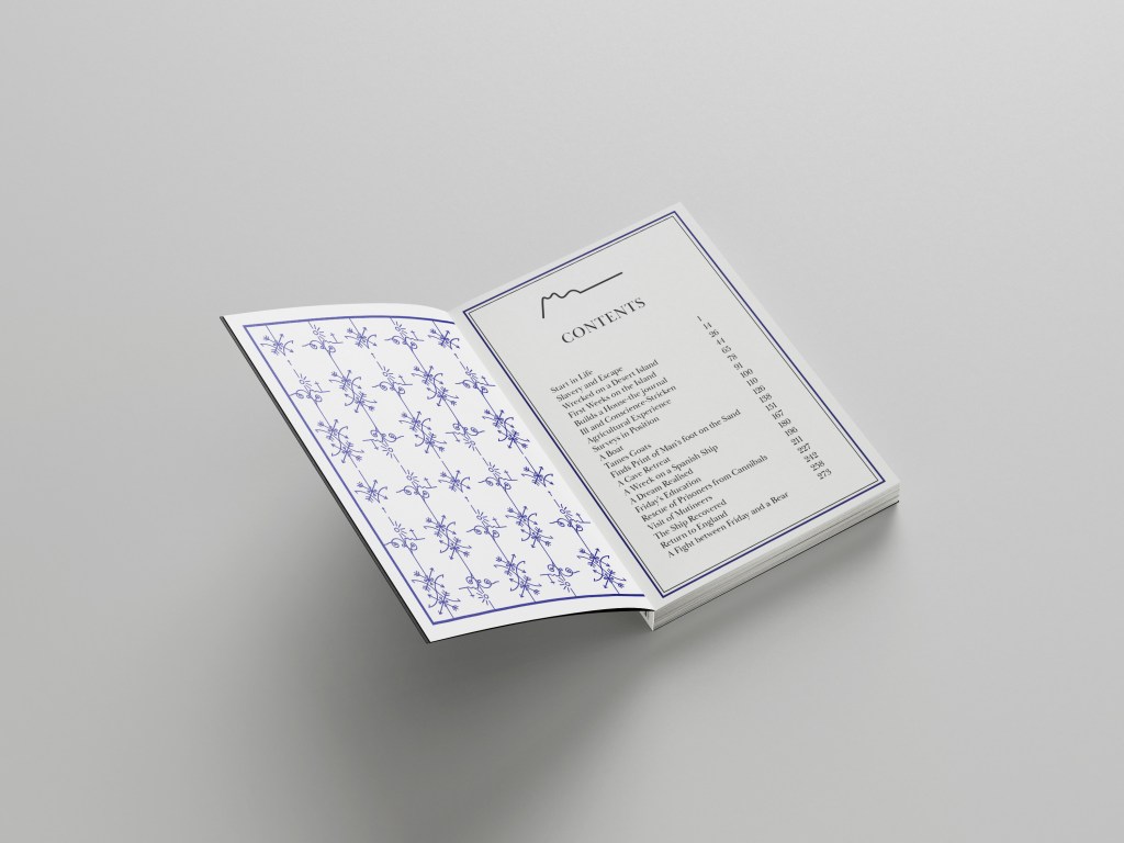 For this book I would want to go somewhere in-between the other 2 books.. Robinson Crusoe hardback edition was luxurious and used luxury paper, Robinson Crusoe the paperback edition was more basic as a travel, pocket sized book that would be folded and creased inside a backpack or pocket whereas this copy would be somewhere in-between – possibly a book you would take on holiday with you but not carry around in a bag.. maybe just a coffee table/bedside table read. It wouldn’t need to be super light weight because of the fact it is not being carried around. I envision a glossy mid-weight cover and glossy lightweight pages inside…