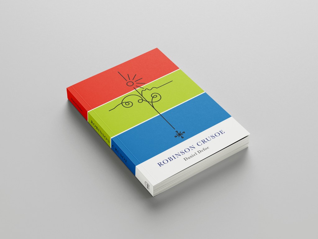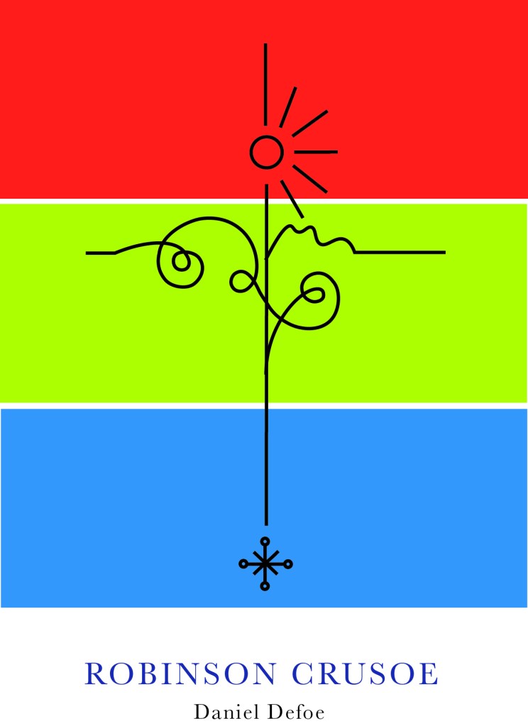 Although Robinson Crusoe is in no means related to this art form, I liked the minimalist, bold look. The colours contrast each other well and represent the sea, sand and danger! Even the text at an angle represents a ship going down which does tie in nicely with the narrative of Crusoe. The overall look of the cover gives sea sick, dangerous choppy waters, rough sea vibes.