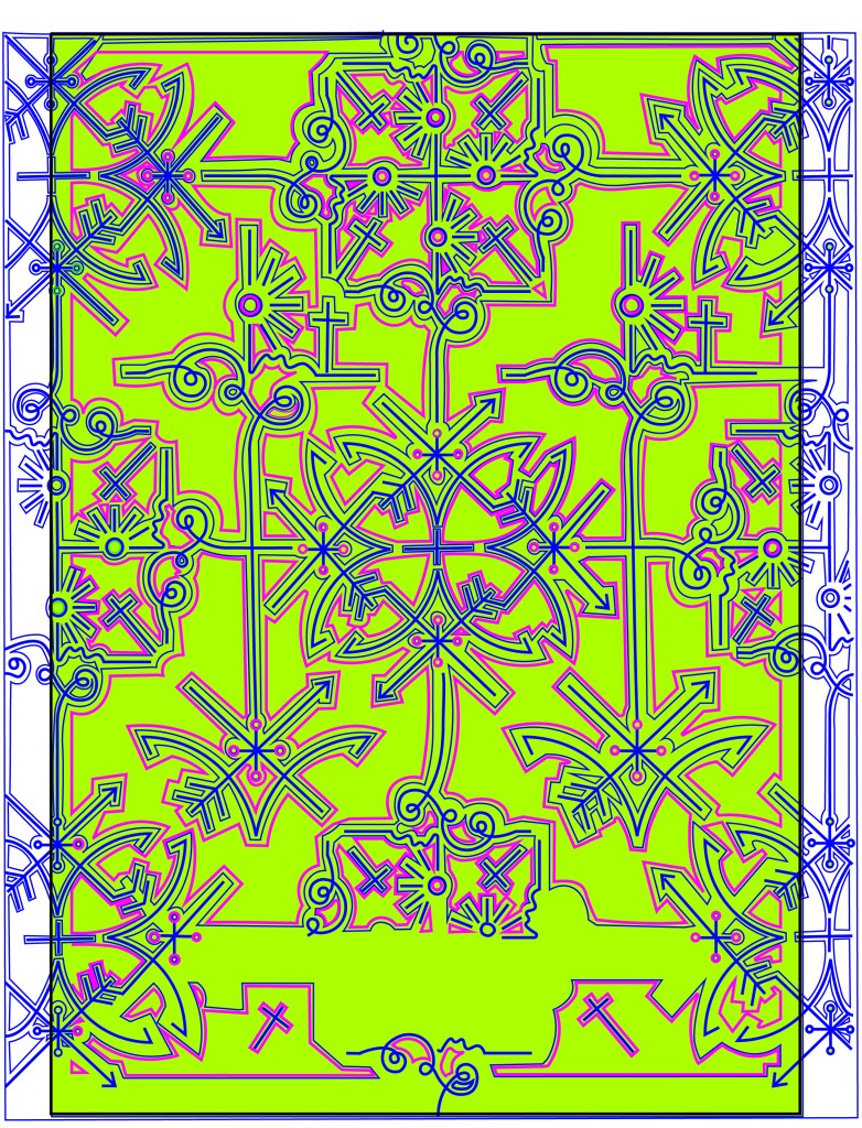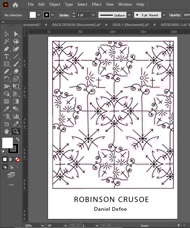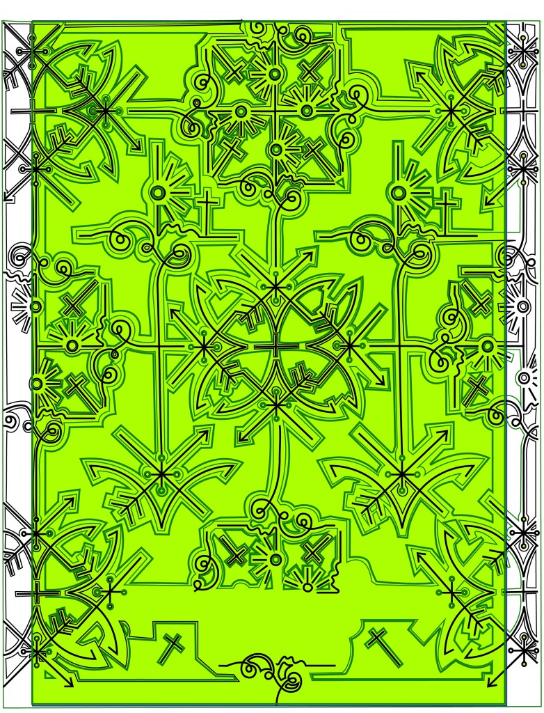 The problem is that although I love the little, old antiquated laser cutter at work it is not compatible with Adobe or modern programs! To get my design from Illustrator over to the laser cutter I had to use the laser cutters software which is 2D Design.. (that is another b*tch!!) and manually draw around my design again so that it is readable for the laser cutter. That was great! – 2 solid work days later (whilst the rest of the school were on activity days!) I had perfected the stencil in 2D Design… I had also completed the whole book cover layout in InDesign which I was really pleased with. The plan was to print out the layout from InDesign of the whole book cover – including the original front cover and then place this onto the laser bed in the laser cutter… using the 2D Design document with the second stencil of the design I drew, use the laser cutter to go over my original drawing on the printed copy on the laser bed.. sounds complicated right?.. It actually really was… trying then to communicate to the laser cutter the exact, precise location to cut.. nope… 2 days completely wasted on this!