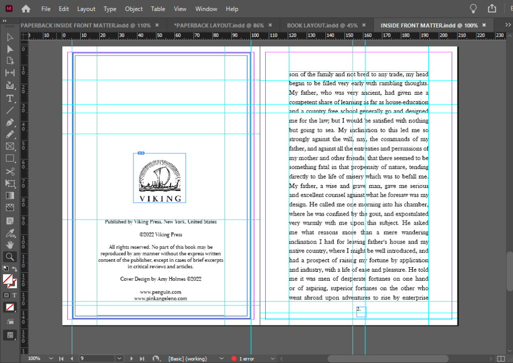 As with the last two layouts I have designed I did exactly the same for this one and created a document in InDesign and created 3 pages, 1 of which I altered to make the correct size for a spine. For this design I didn’t include inside front and back cover flaps.