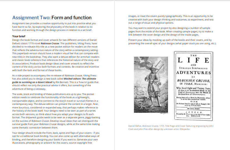 This gave me an understanding of how I would need to print and collate the pages and back boards etc to bind and make into a book. With my printed version of Robinson Crusoe though, there wasn’t enough pages to make up a book and my spine was too thick for the limited pages I had. I did however paginate my pages correctly in InDesign so that when they printed out they were all in order, (It wasn’t such a long drawn out process since I already had experience in doing the pages for my zine!) I then could see how I would sew the pages and bind them together and then my front and back cover would be printed onto a hard board and the inside front cover adhered onto the inside with the pages of the book glued to the spine.