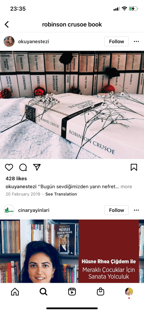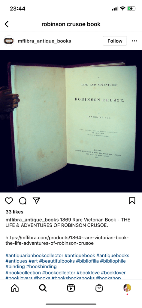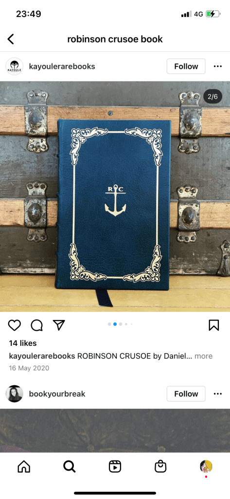 As I was on a tight timeframe I didn’t want to waste any time I had in trying to research into covers as I knew that this assignment wouldn’t be a quick process! – therefore even sitting in bed at nights I was looking at Amazon, Ebay and Instagram to see their copies of Robinson Crusoe!