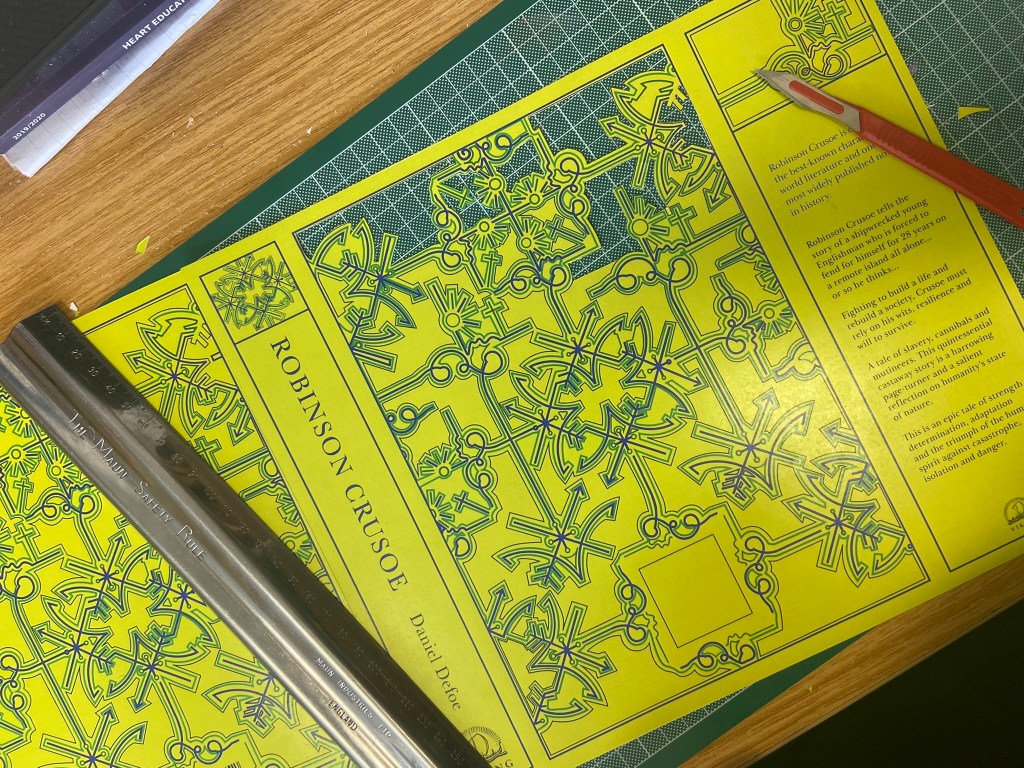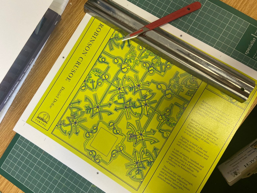 I took my printed copy of the layout I produced in InDesign and cut it out using a scalpel knife – it didn’t give the same professional appearance but it was the best I could offer at this point! For another solid work day I spent cutting out the front and back covers of the book!